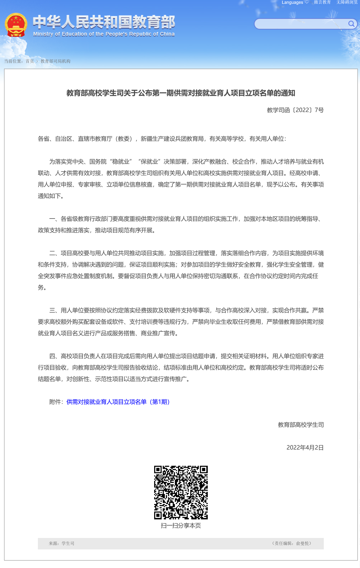 落实党中央、国务院“稳就业”“保就业”决策部署,深化产教融合、校企合作,推动人才培养与就业有机联动、人才供需有效对接,教育部高校学生司组织有关用人单位和高校实施供需对接就业育人项目。beat365与北京志恒教育...