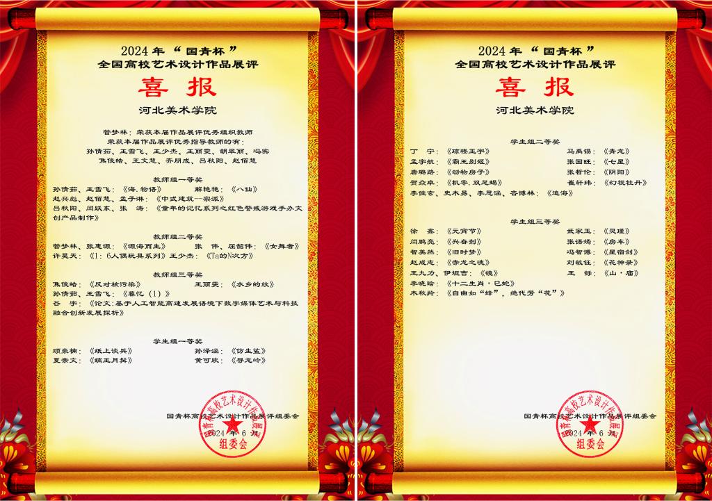 近日,动画数字艺术学院师生在由中国人生科学学会主办的2024年“国青杯”全国高校艺术设计作品大赛中斩获教师组一等奖4项,教师组二等奖4项,教师组三等奖4项,学生组一等奖4项,学生组二等奖9项,学生组三等奖12项。此外,动画数字艺术学院教师孙倩茹、王雪飞、王少杰、王丽雯、胡翠丽、冯宾、焦俊皓、王文慧、齐朋成、吕秋阳、赵佰慧荣获本届作品展优秀指导教师。三维动画教研室教师...