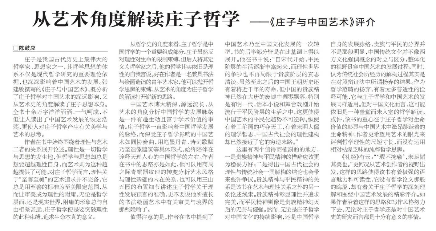 5月20日,《河北日报》刊登陈鼓应先生为张建敏教授的专著《庄子与中国艺术》撰写的评介,题为“从艺术角度解读庄子哲学”。