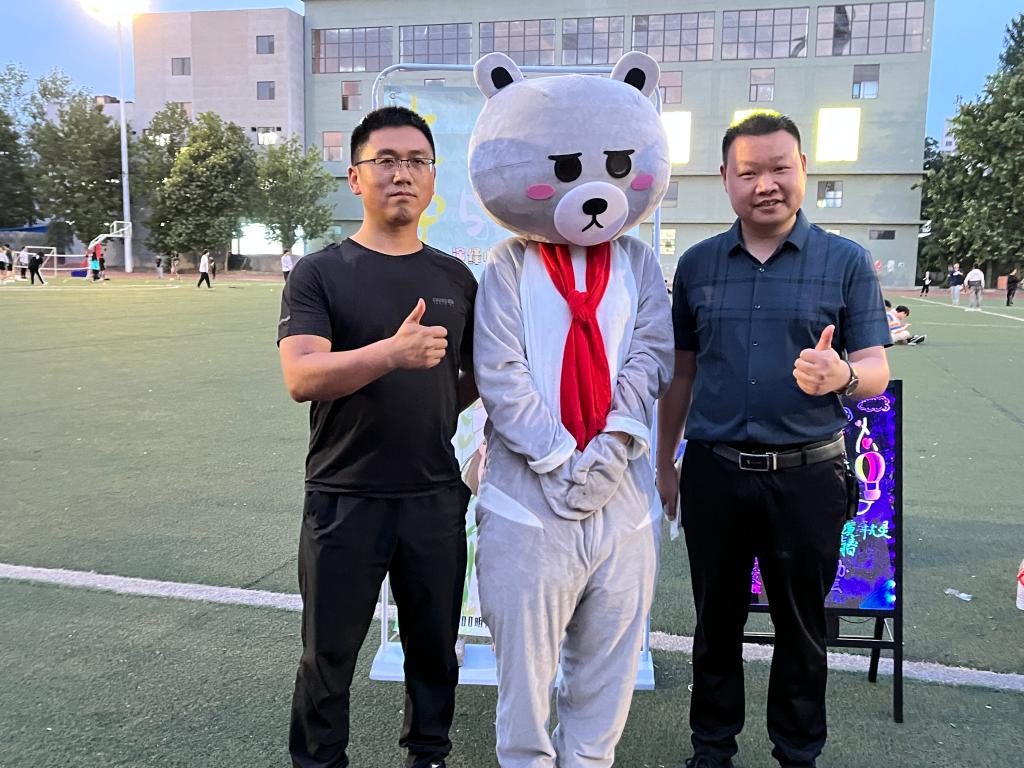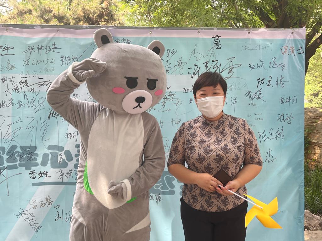 造型艺术学院党总支副书记窦俊杰与抱抱熊合影留念