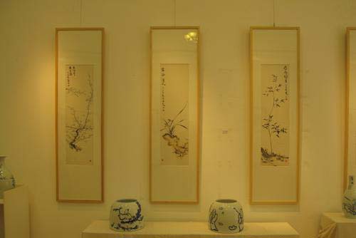 在展出的作品中,不仅有淡雅宁静的山水、恬静雅致的人物,同时,还成功地尝试了书画作品与陶瓷作品的结合,二者相互映衬,相辅相成,成为本次展览的亮点。