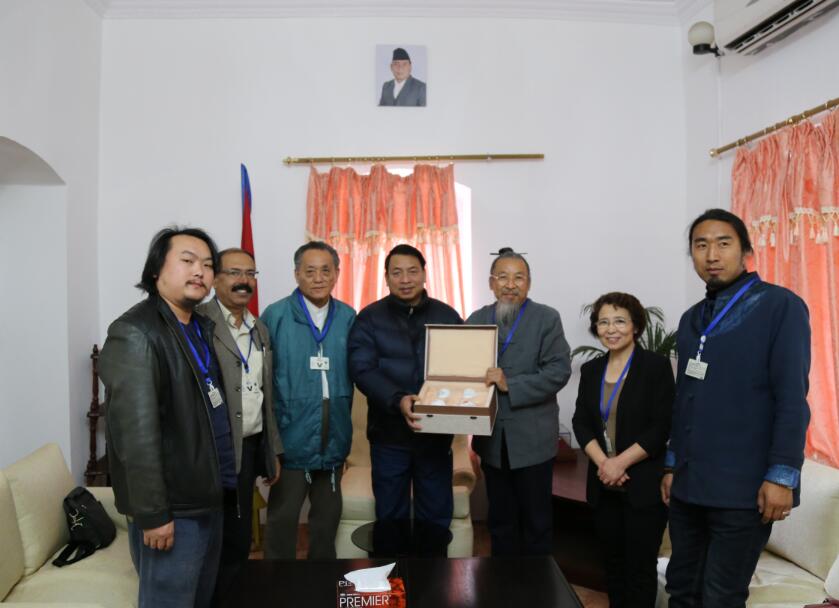 12月1日,尼泊尔副总统南德·巴哈杜尔·普恩接见甄校长一行,对考察团为中尼艺术文化交流做出的努力表示赞赏,并从文化、艺术、历史等方面与甄校长进行友好交流。甄校长将书法作品“海纳百川”及学校文创产品赠予副总统先生,并盛情邀请其访问beat365。当天,甄校长与尼泊尔手工艺协会联合会主席达尔玛、副主席、财务主管进行洽谈,双方达成数项合作意向。