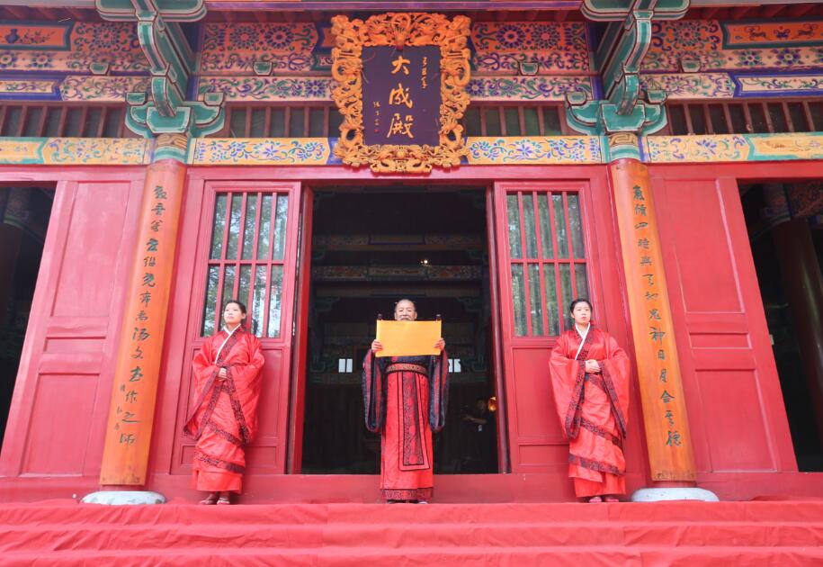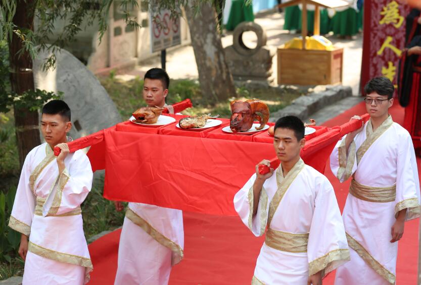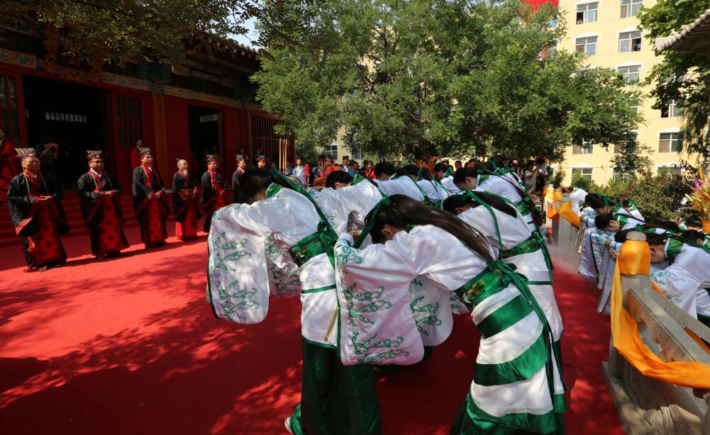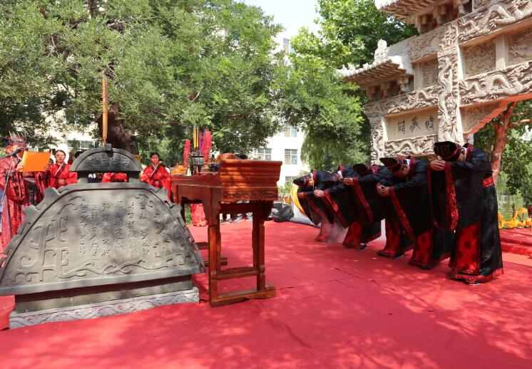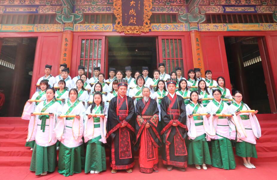 “吉时到,启户”随着礼赞声起,大成殿门开,八佾舞起。甄忠义校长为主祭人,敬香行揖礼,敬献锦帛、酒爵,宣读祭文敬告圣人,歌颂“仁者爱人”、“以礼立人”以及“有教无类”、因材施教”的教育思想。陪祭人张建敏、张子言、王志民、甄心恒、甄墨、成范永等依次行亚献礼。众学子在礼赞的主持下,齐诵《孔子赞》,行三拜之礼,感谢父母的养育,导师的教育以及母校的培养。
