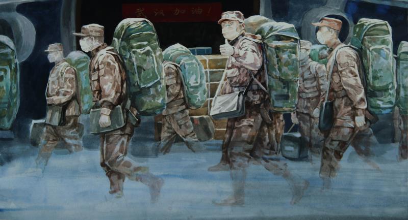 作品说明:通过刻画武汉机场解放军医护人员正在连夜奔赴抗击疫情的战场的情景和背景后面隐约露出的运输机,说明了中国军队的强大,国家对这次疫情的重视。一排排解放军军医戴着口罩、迈着整齐的步伐开赴抗击疫情的战场,视死如归!奋斗在抗疫一线的医生们是一位位保卫着我们的战士,守护着我们的生命,鞠躬尽瘁,舍小我而为大我。他们是为中国人民的生命而战!在这个特殊的历史时期,所有人都付出了很多心血。我们的心永远凝聚在一起,共渡难关,战胜疫情,以此向那些英雄们致敬!疫情无情,世间有爱,相信我们团结一心,同舟共济,胜利的曙光就会到来!武汉加油!中国加油!