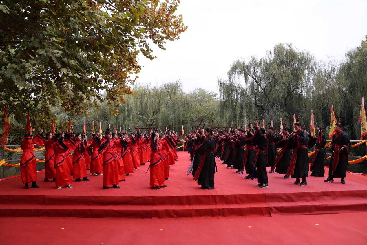 上午8:00,典礼现场彩旗飘飘,气氛庄严。众人满怀敬畏之心,身着汉服,共同朗诵《论语》,缅怀至圣先师孔子。64位八佾舞者左手执龠,右手执羽,踏乐起舞,动作简洁庄严。