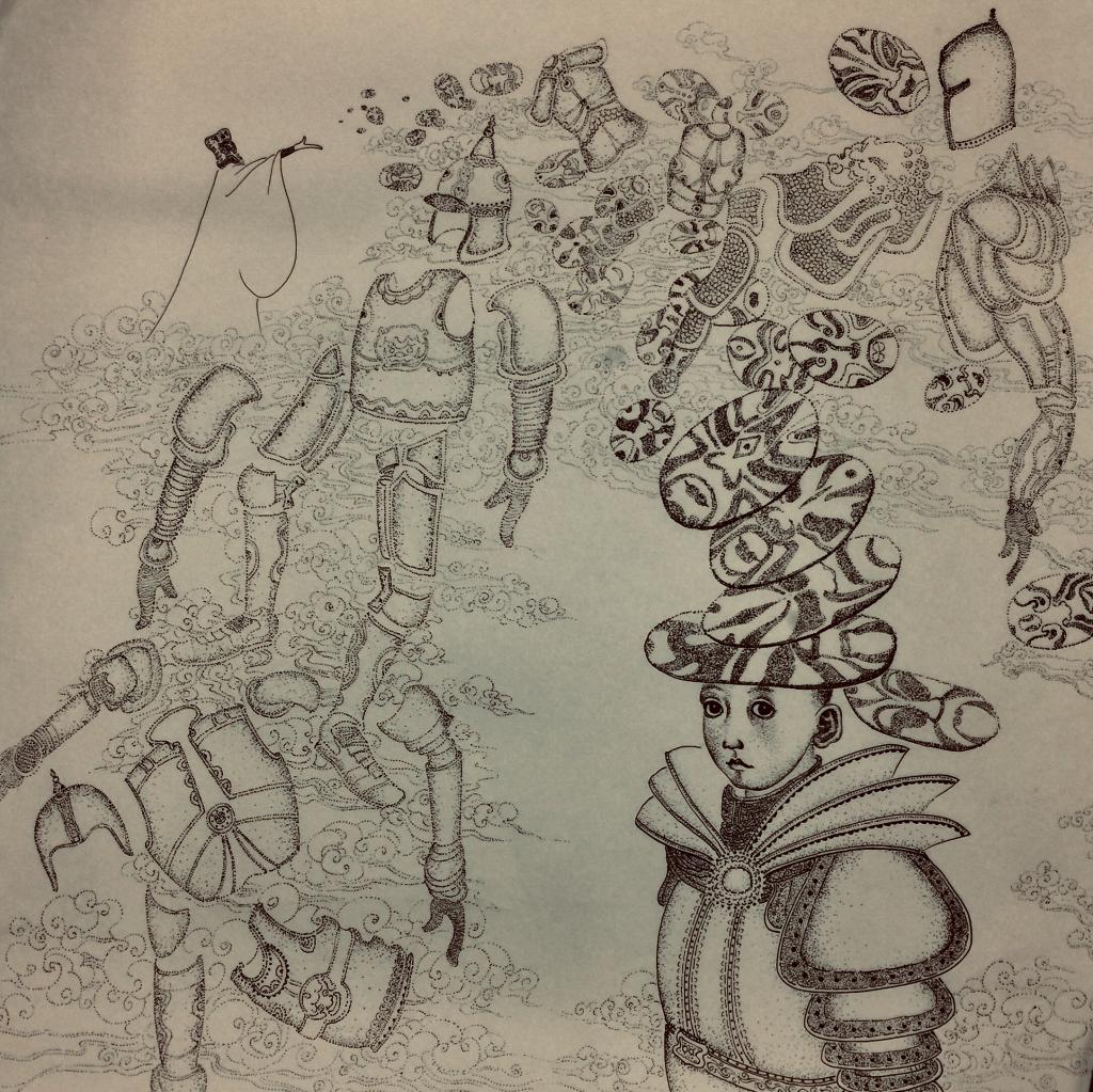 《铠甲面具》作者卢龙 尺寸60cmx66cm 材质硬笔过滤纸