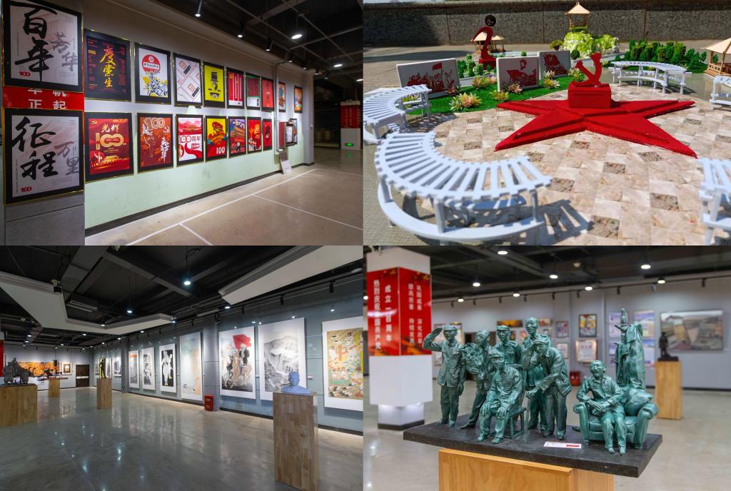 本次艺术作品展紧紧围绕建党百年主题,涵盖了绘画、书法、篆刻、雕塑、设计类、服饰类等多个艺术门类的师生作品,共计300余件,内容丰富,形式多样。