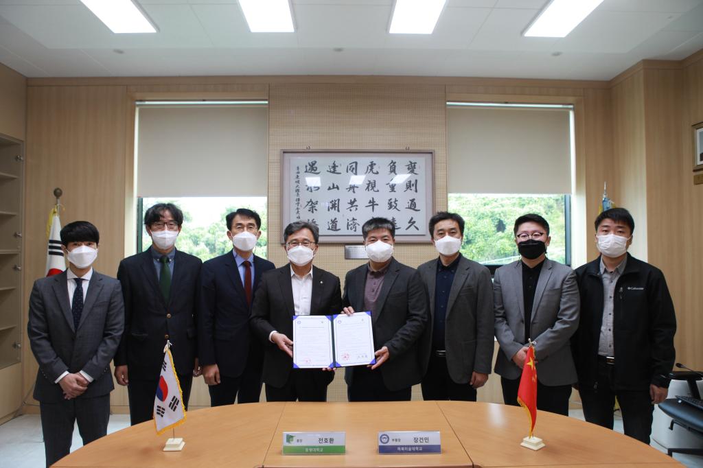 张建敏副校长与全虎焕校长各自介绍了两校基本办学情况,并就教师交流、学生交换、科研合作等内容交换了意见,双方在东明大学举行了缔结友好学校协议书签字仪式。