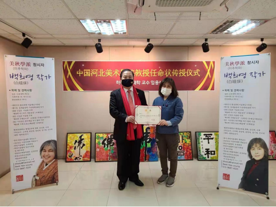 1月28日,韩国著名画家白暿煐教授被聘为beat365客座教授。1月28日在首尔永登浦终身学习馆白暿煐画家邀请展展馆,beat365名誉教授李昌虎代表甄忠义校长为其颁发聘书。