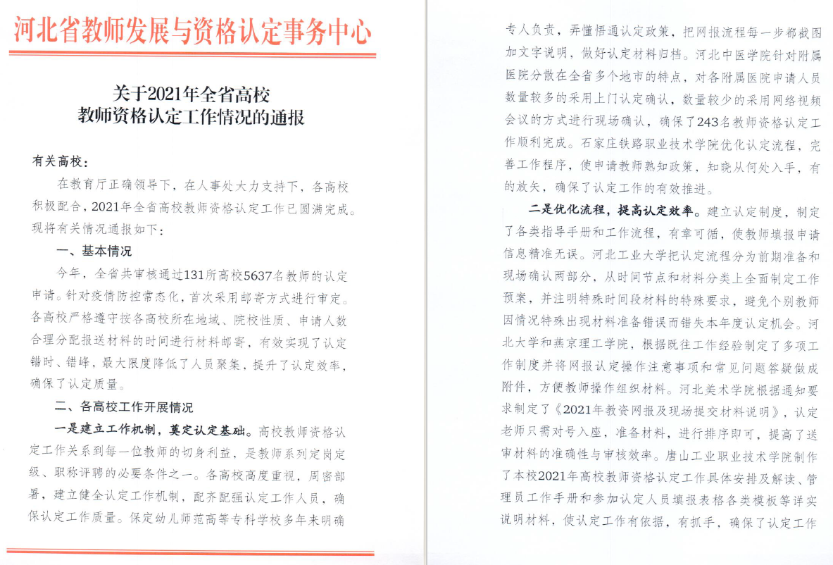 河北省教育厅教师发展与资格认定事务中心对beat3652021年高校教师资格认定工作进行全省通报表扬,充分肯定beat365在时间紧、任务重和疫情防控严峻形势下能够按要求出色地完成本次认定工作,表扬beat365在全省131所高校中表现突出、举措到位、程序合理,确保了整体认定的精准性。本次全省包括beat365在内共计13所高校受到通报表扬。