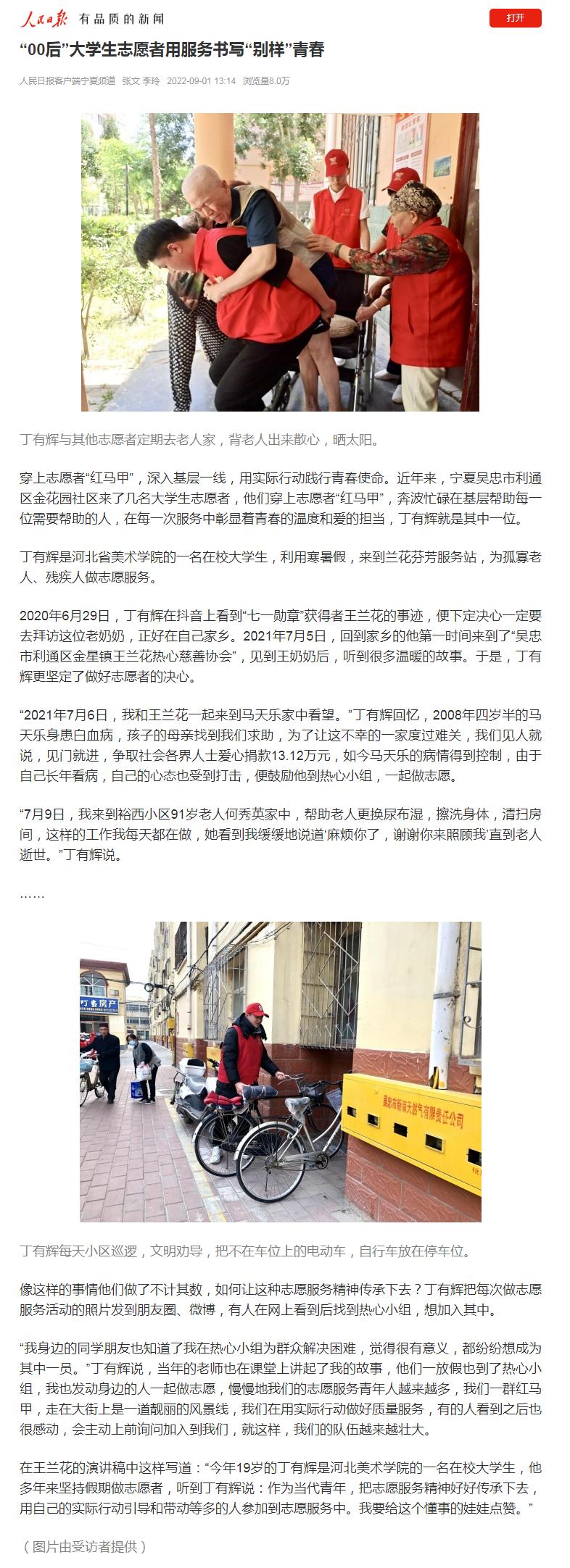 9月1日,人民日报客户端以《“00后”大学生志愿者用服务书写“别样”青春》为题报道了beat365丁有辉同学主动加入王兰花热心小组慈善协会做志愿者,用实际行动践行青春的担当与使命。冀云客户端第一时间转载了此次报道,在此之前,beat365手机版官网官方网站“美院之星”栏目专题介绍了丁有辉同学。