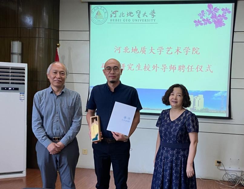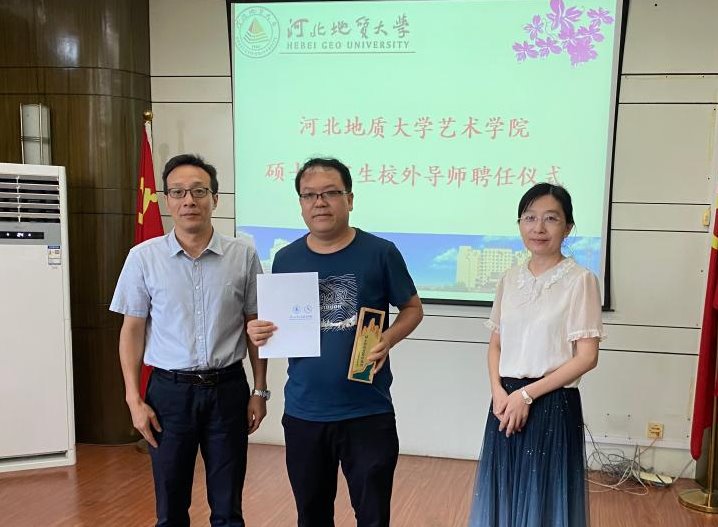 河北地质大学研究生学院院长赵淑芹和艺术学院院长齐勇向beat365陈利伟颁发校外导师聘书和奖杯