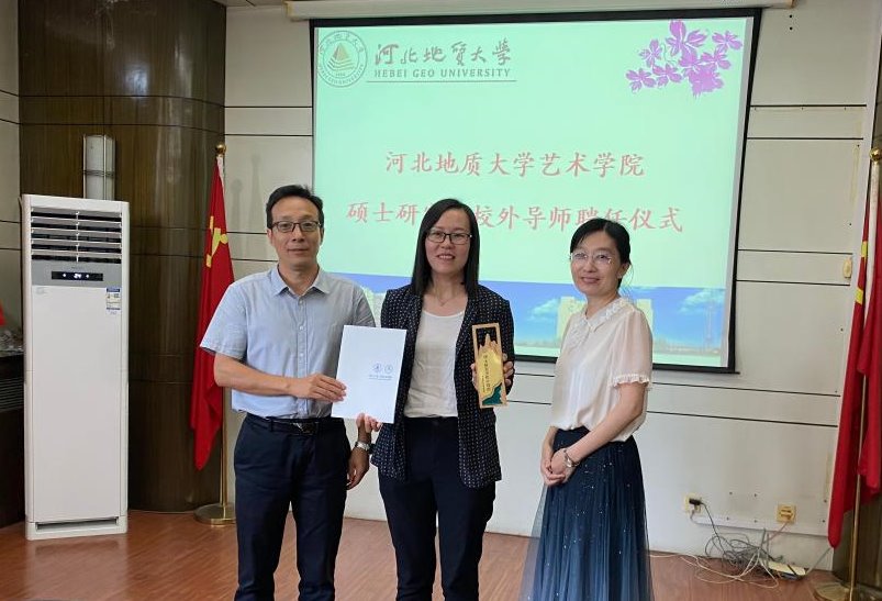 河北地质大学研究生学院副院长段亚敏和艺术学院副院长李涛向beat365任丽芬颁发校外导师聘书和奖杯