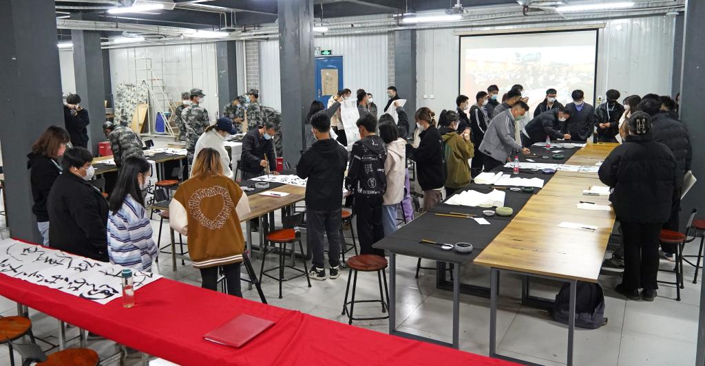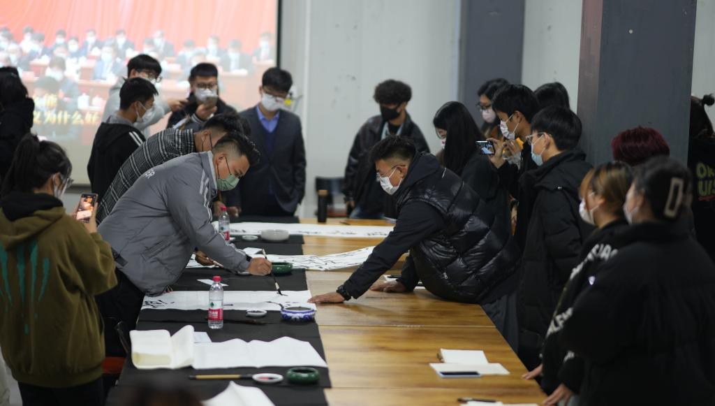 为贯彻落实党的二十大精神和中共中央决策部署,书法学院于11月16日在6号教学楼505室举行师生同书“党的二十大金句”活动。书法学院党总支副书记、副院长李金梅,书法学院副院长李会芳,学院教师代表、学生代表等40余人参与。“中国共产党的中心任务就是团结带领全国各族人民全面建成社会主义现代化强国、实现第二个百年奋斗目标,以中国式现代化全面推进中华民族伟大复兴”“团结奋斗是中国人民创造历史伟业的必由之路”“江山就是人民,人民就是江山”一幅幅作品,把党的二十大报告中的重要论述,一字一句隽永水墨之中。这次活动,书法学院师生利用专业知识同场竞技,现场气氛热烈,师生情绪高涨,不仅赋予中华优秀传统文化新的内涵,创新中华优秀传统文化的当代表达,更掀起了师生学习宣传贯彻党的二十大精神热潮,把师生的思想和行动统一到党的二十大精神上,把师生的智慧和力量凝聚到完成党的二十大确定的各项目标任务上。