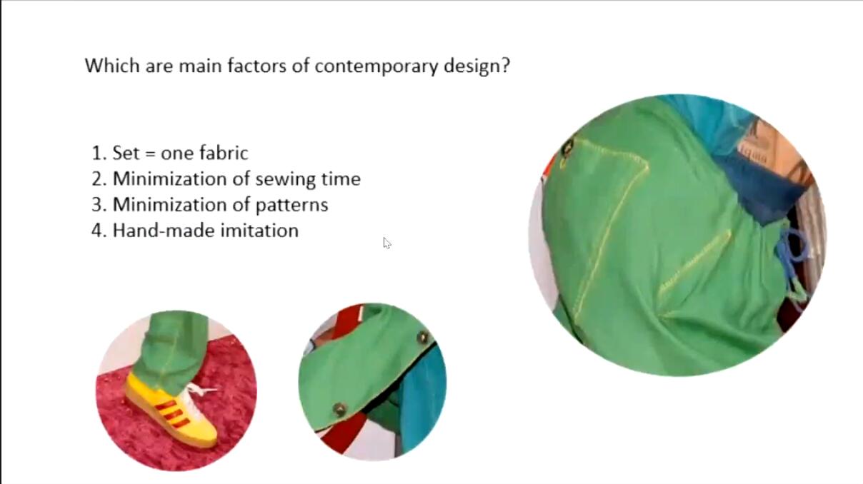 第一个模块包括现在流行时尚概念的变化。他认为时尚不再与大发行量、高边缘化和声望联系在一起,不同的时尚未来会出现在不同的领域——廓形、技术、颜色、质地面料、手工。此外还讲了一些与服装设计生产相关的关键词与一些时尚界合作的案例。此外还就消费者品牌消费和舒适度着装的问题进行了分析,讨论了时尚界的热门话题-可持续性发展以及时尚界广告新的动向。