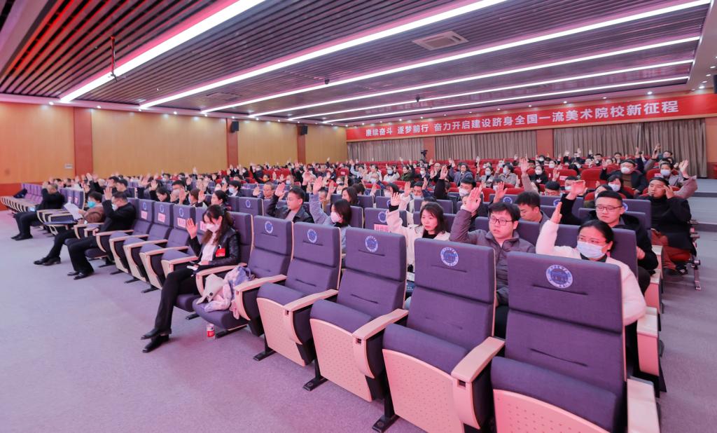 上午9时,大会在雄壮的国歌声中开幕。学校举办者、校长甄忠义以《赓续奋斗 逐梦前行 奋力开启建设跻身全国一流美术院校新征程》为题作学校工作报告。报告全面系统地总结了2022年学校在疫情防控、党建工作、教育教学、学生管理、科研与学科建设、师资建设、招生就业、国际交流等方面取得的成绩,提出了2023年的工作任务。报告指出,2023年,是全面实施“十四五”规划的关键之年,是学校申硕的决胜之年。我们必须加强党对学校工作的全面领导,紧跟国家发展步伐,加快落实学校“广积粮、推围墙、要成王”的九字发展方针,实现“高水平教学科研团队、国家级重大项目立项、国家级奖项、国家级平台、硕士授予权”五大突破,开启建设跻身全国一流美术院校、争创世界一流美术院校新征程。
