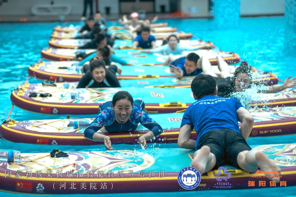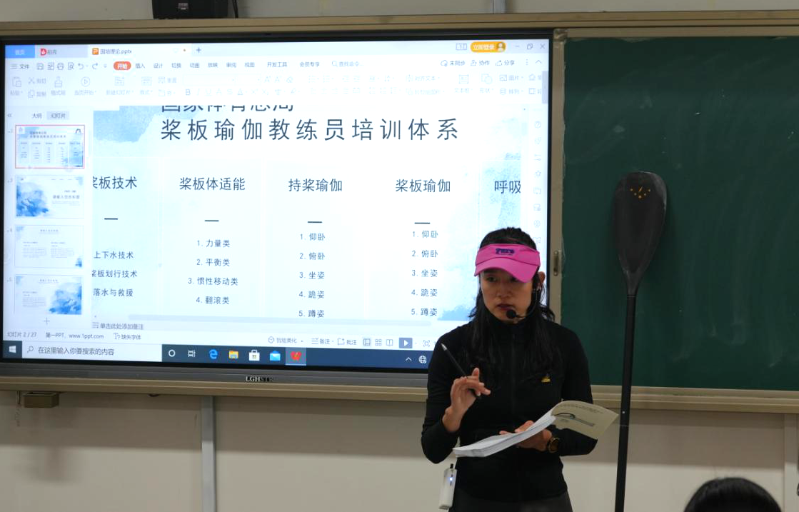 本次培训讲师团队由国家体育总局水上运动管理中心桨板瑜伽教练员培训主讲师李秀红和技术讲师晏艺文担任,向体育工作部12名体育教师讲授桨板瑜伽运动基础理论、桨板瑜伽运动实践、持桨瑜伽、桨板体适能、瑜伽呼吸与正念冥想、国家体育总局桨板瑜伽培训体系理论等教学内容。