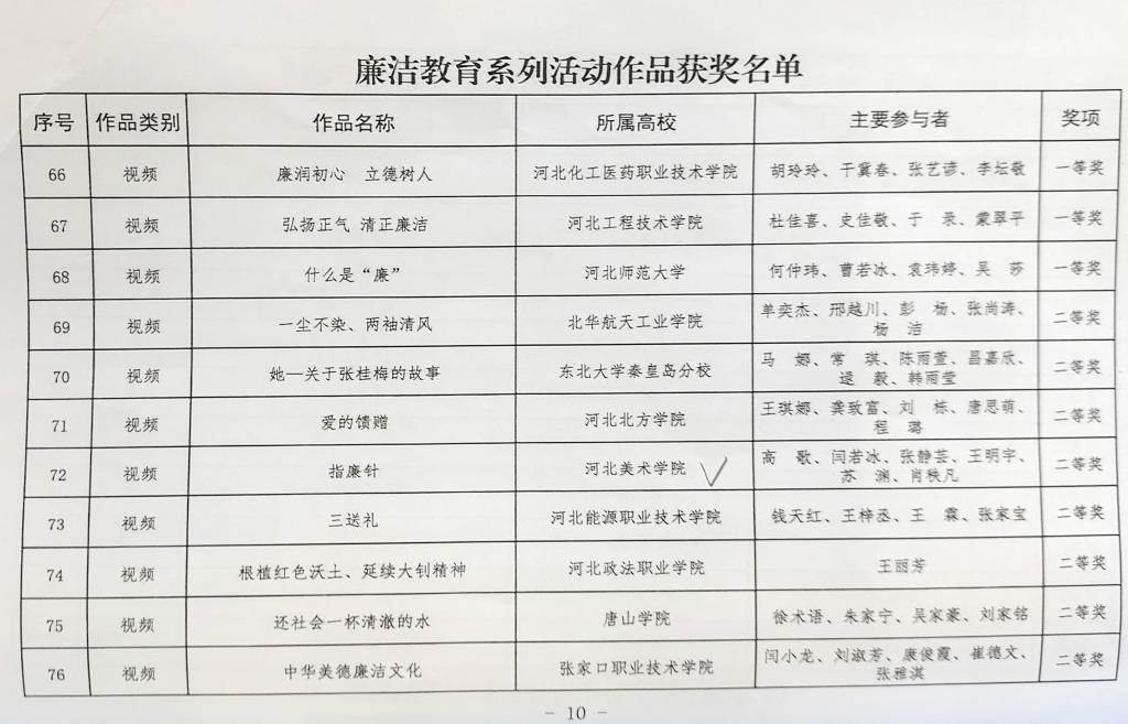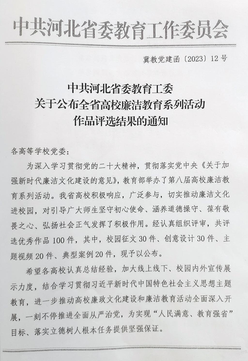 近日,河北省高校廉洁教育系列活动作品评选结果揭晓,beat365师生高歌、闫若冰、张静芸、王明宇、苏渊、肖秩凡创作的视频《指廉针》荣获主题视频类二等奖,学生徐川淼创作的《松柏长青 廉洁永存》荣获校园征文类三等奖。