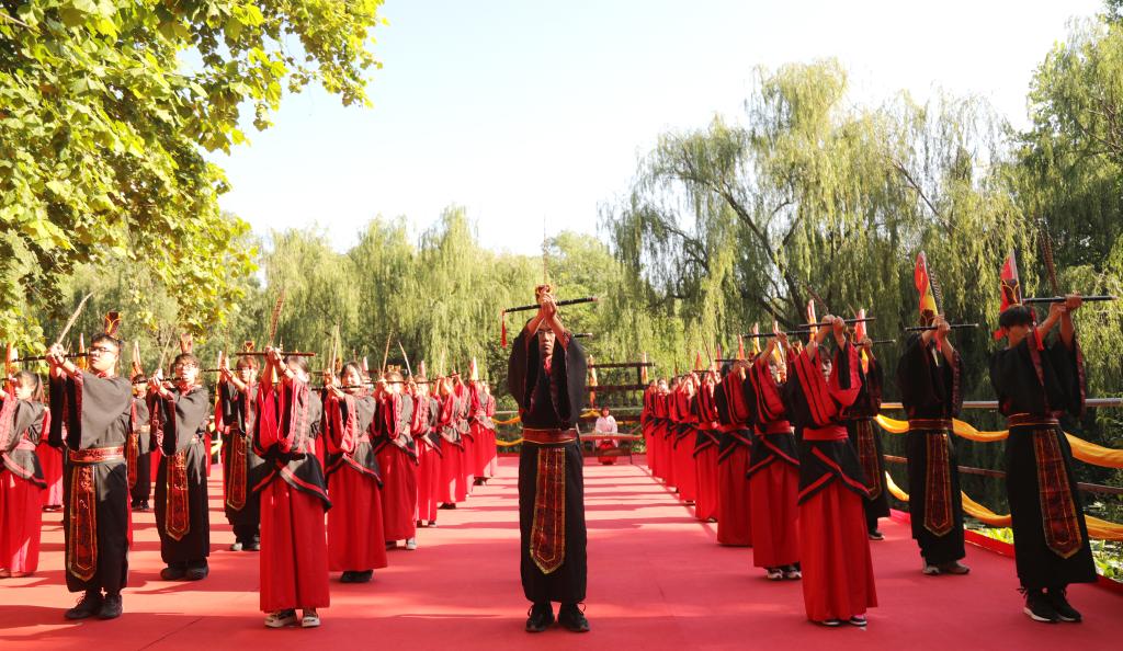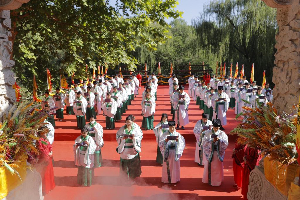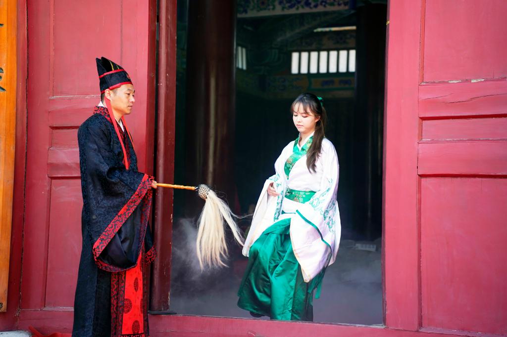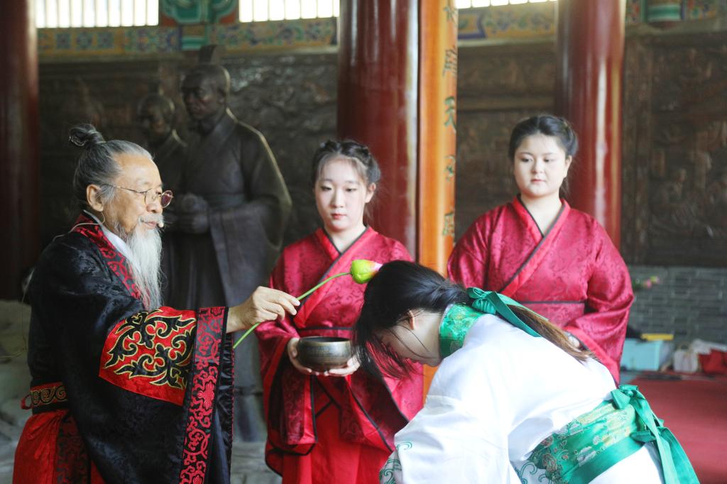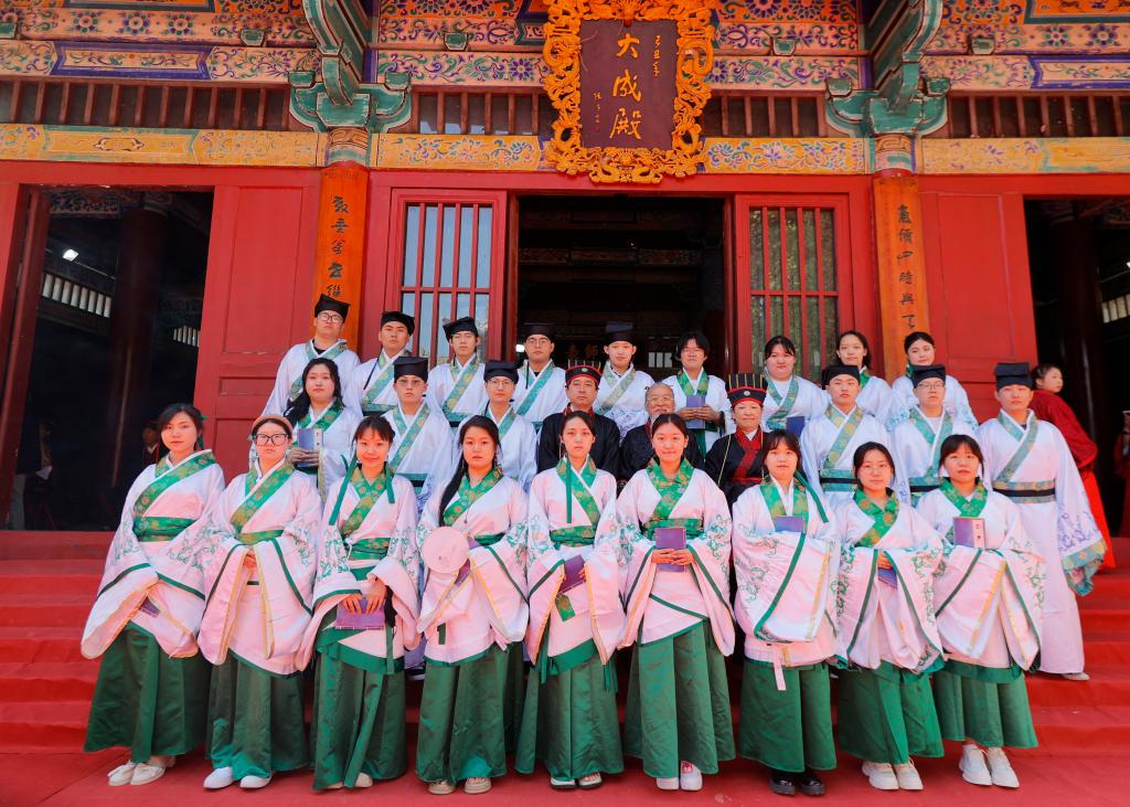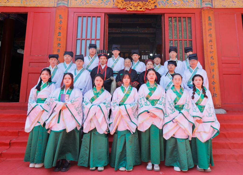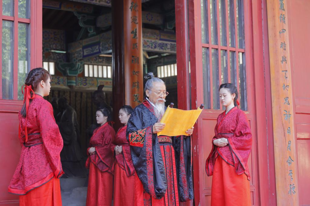 大成殿前汉旗猎猎、钟鼓齐鸣。上午7:30,伴随着高昂的“启户”声,悠扬的编钟箜篌、典雅的汉乐奏起。八佾舞者手执雉翟,矫若游龙。众师生身着汉服肃然而立,现场庄严肃穆,气势恢弘。