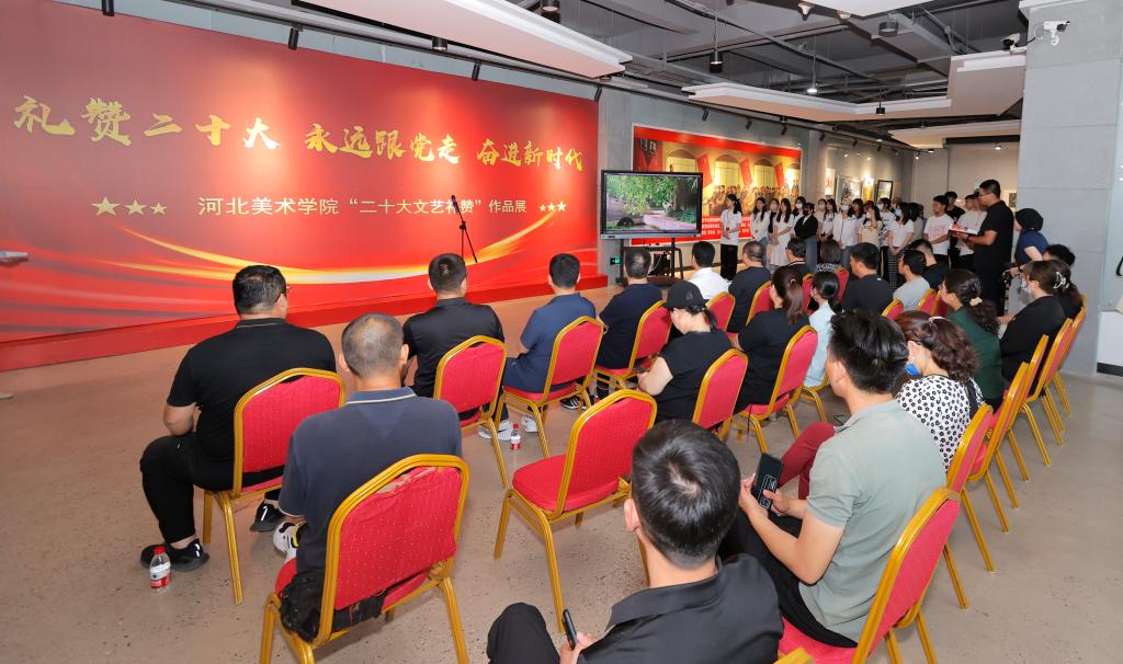 裴红彬致开幕辞。他指出,学校非常重视党建工作,坚持用中国式现代化理论指导实践,探索出了beat365手机版官网自己的道路,提出了为民族立传、为时代立传、为人民立传、为山河立传的创作导向,师生以此为指导创作出了大量优秀作品。此次作品展紧紧围绕宣传党的二十大、歌颂党的二十大这一光辉主题,凝聚了广大师生爱国爱党的真挚情感,这既是一次学习贯彻党的二十大精神、献礼党的二十大的艺术实践,也为新时代新征程的文艺创作吹响了集结号。今后,我们要继续深刻领会党的二十大精神的丰富内涵,紧跟党中央的步伐,用党的二十大精神推动学校各项工作开展,为建设社会主义文化强国、教育强国贡献力量。