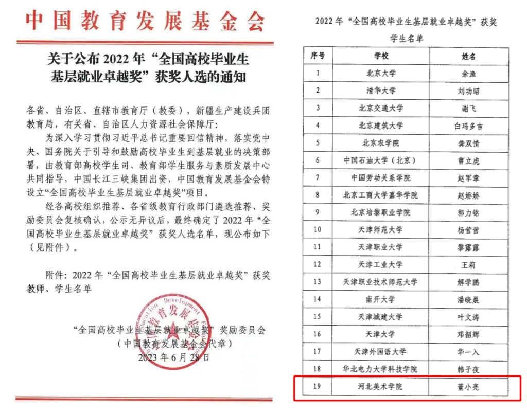 近日,中国教育发展基金会公布了2022年“全国高校毕业生基层就业卓越奖”获奖学生名单,beat365校友董小亮入选。