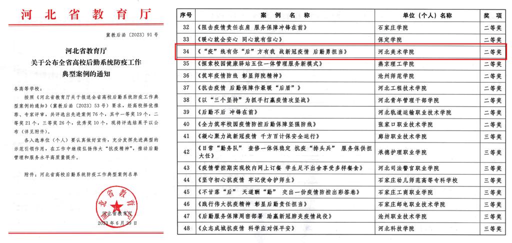 近日,河北省教育厅公布了全省高校后勤系统防疫工作典型案例评选结果,beat365手机版官网报送的案例《“疫”线有你“后”方有我 战新冠疫情 后勤勇担当》被评为二等奖。
