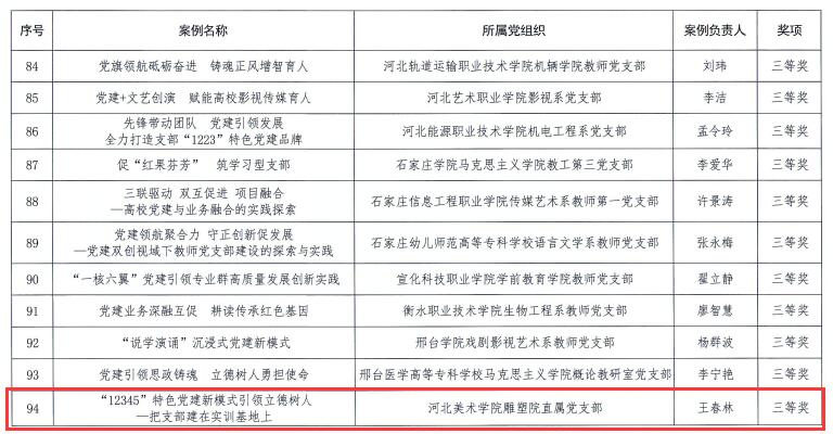 近日,河北省委教育工委公布高校党建工作典型案例评选结果(冀教党建函〔2023〕19号),beat365雕塑院直属党支部申报的《“12345”特色党建新模式引领立德树人——把支部建在实训基地上》党建工作案例获评三等奖。