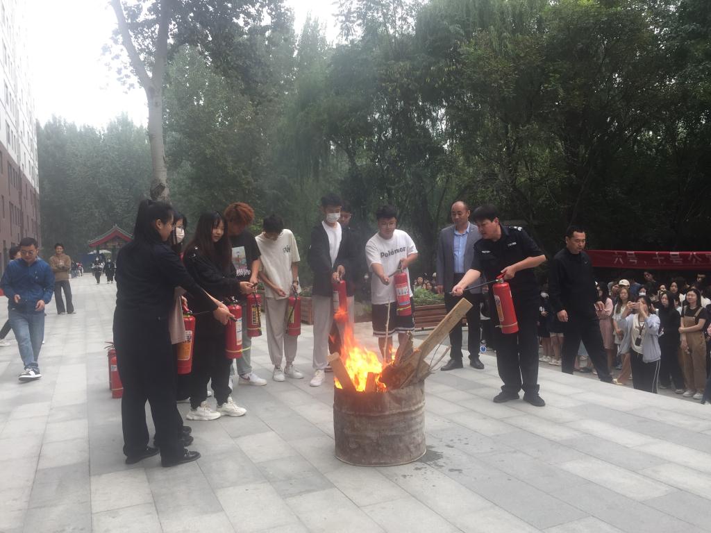 疏散结束后,安全工作处消防科科长安争力对参演师生和楼管员讲解了灭火器使用方法,并组织进行实操灭火。