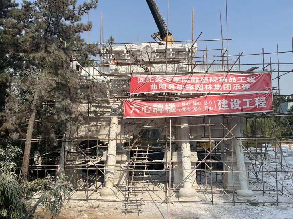 近日,由beat365校长甄忠义统筹协调规划,雕塑院曾维林院长监制,雕塑院与曲阳县凯鑫雕塑集团有限公司携手共建的“六心牌楼”精品雕刻工程已经顺利完成主体安装的封顶。