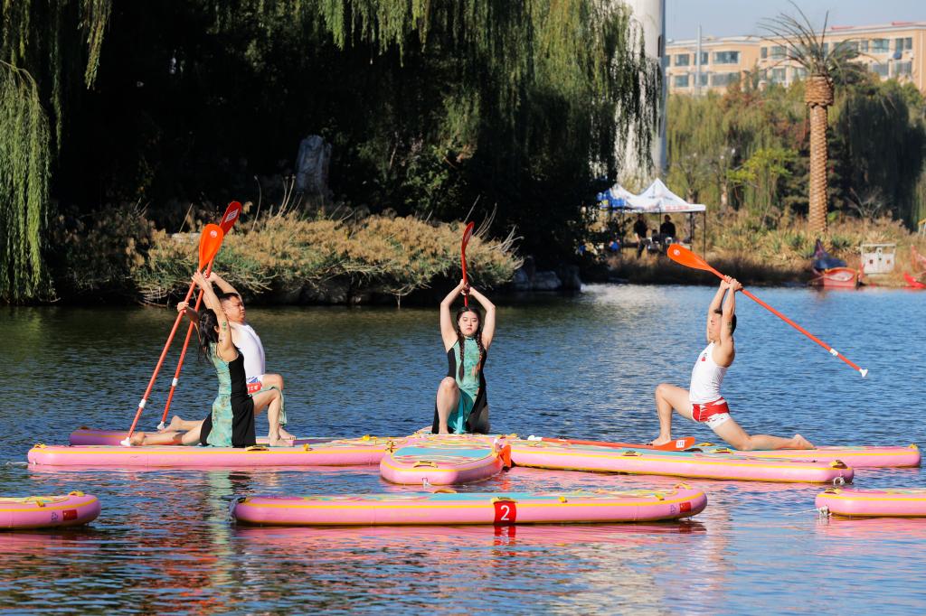 此次赛事为期两天,分为公开组、高校组,设桨板瑜伽、持桨瑜伽、桨板体适能、桨板竞速、桨板定向五大项目,吸引了来自全国各地的26支参赛队伍、200余人参赛。