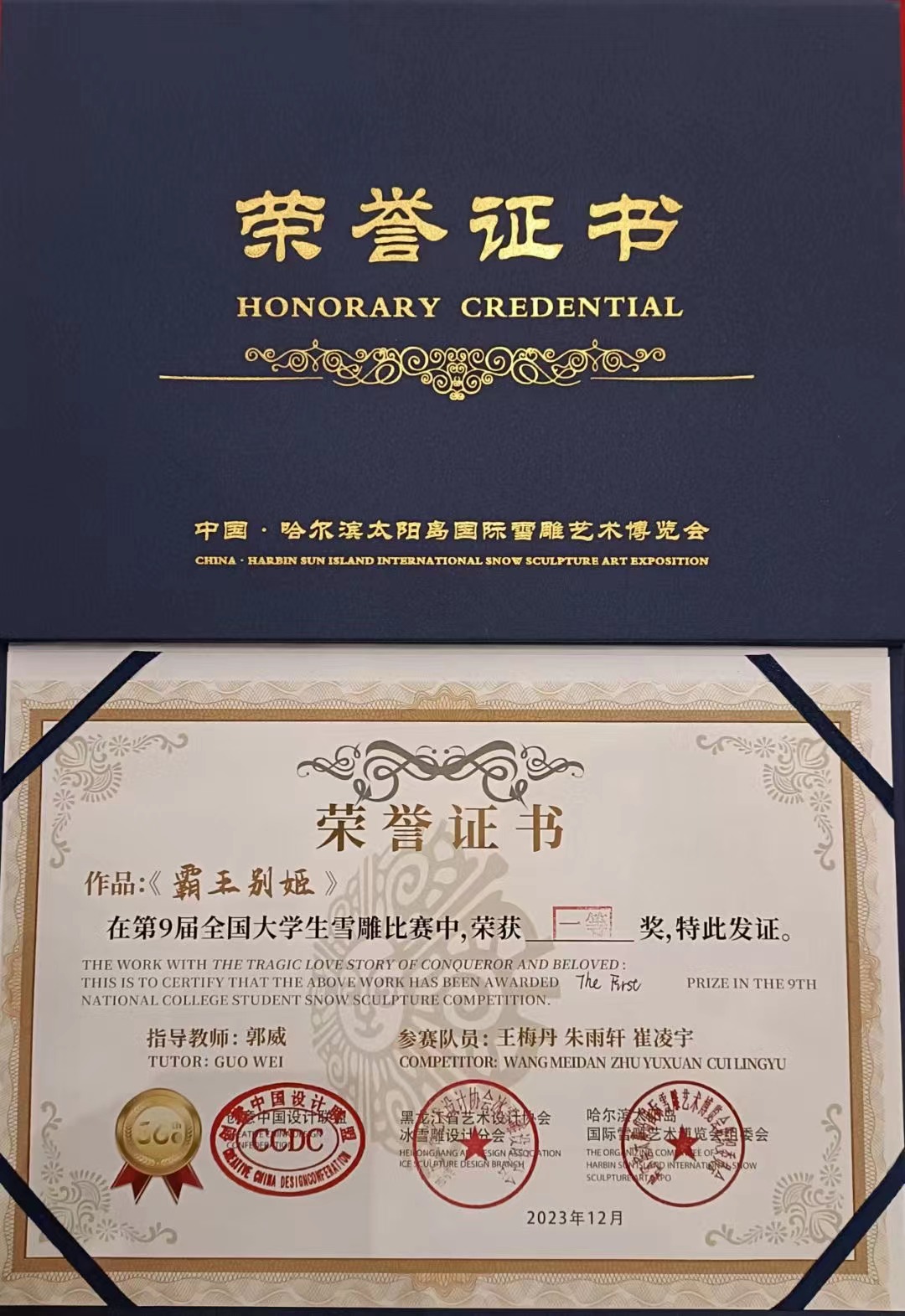 12月19日,第九届全国大学生雪雕大赛在哈尔滨太阳岛雪博会落幕,beat365手机版官网学生斩获殊荣,满载而归。雕塑与公共艺术学院共派出两支队伍参加此次比赛。教师郭威指导学生王梅丹、朱宇轩、崔凌宇的作品《霸王别姬》荣膺桂冠;教师牛玮春指导学生马梓润、潘承宇、牟彦菲的作品《骇浪与鲨》获得优秀奖。