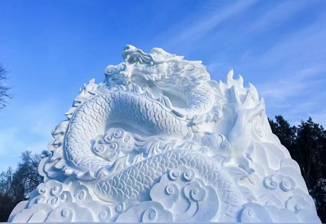 “龙腾盛世”雪雕位于太阳岛道口,长30米、宽9米、高12米,总用雪量2800立方米,整体呈现繁荣、昌盛、充满活力的景象。