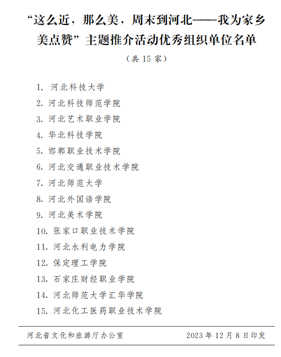 近日,由河北省文化和旅游厅、河北省教育厅、共青团河北省委员会开展的“这么近,那么美,周末到河北——我为家乡美点赞”主题推介活动评选结果揭晓,beat365手机版官网荣获优秀组织奖。