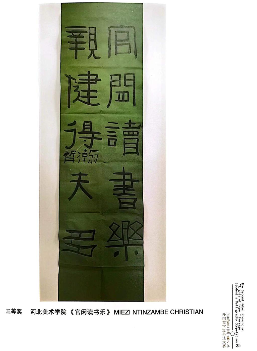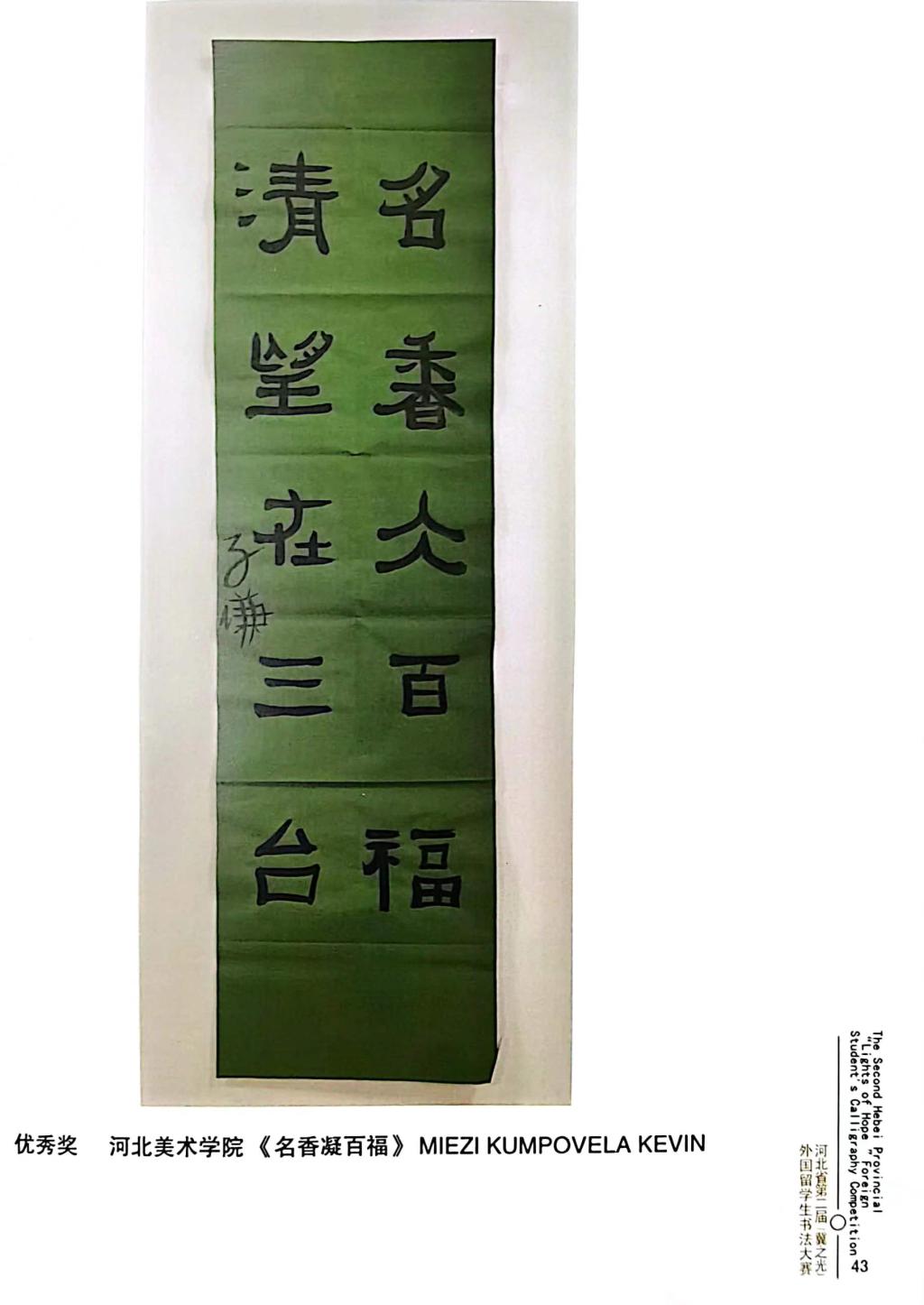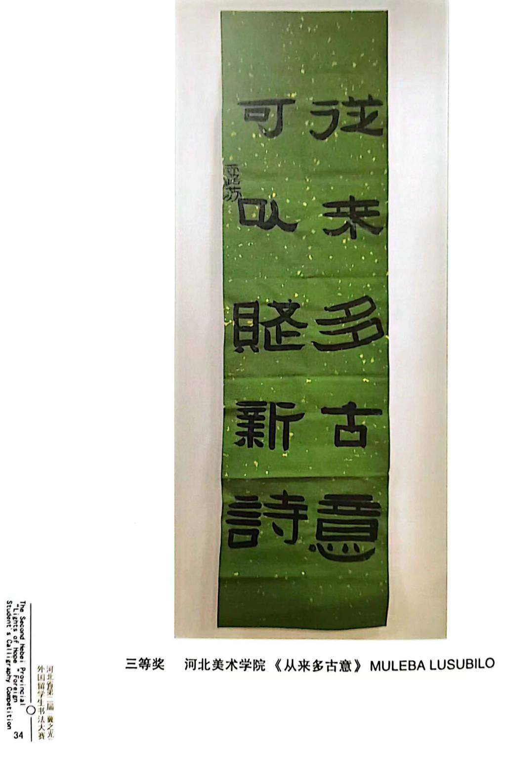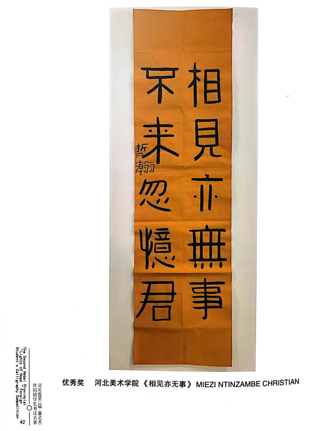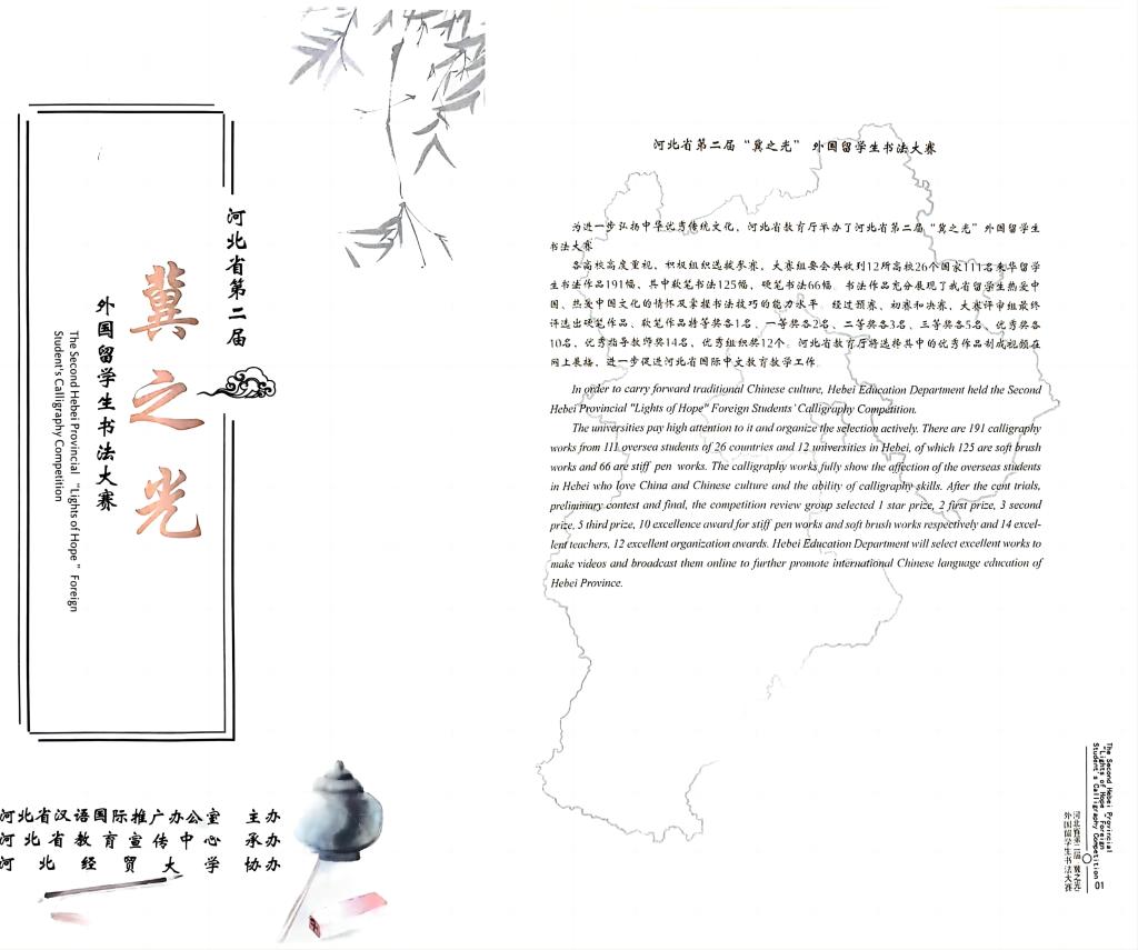 近日,由河北省教育厅主办,河北省教育宣传中心承办,河北经贸大学协办的河北省第二届“冀之光”外国留学生书法大赛获奖作品装订出版。beat365留学生分别获得一等奖1个,二等奖1个,三等奖2个,优秀奖4个。