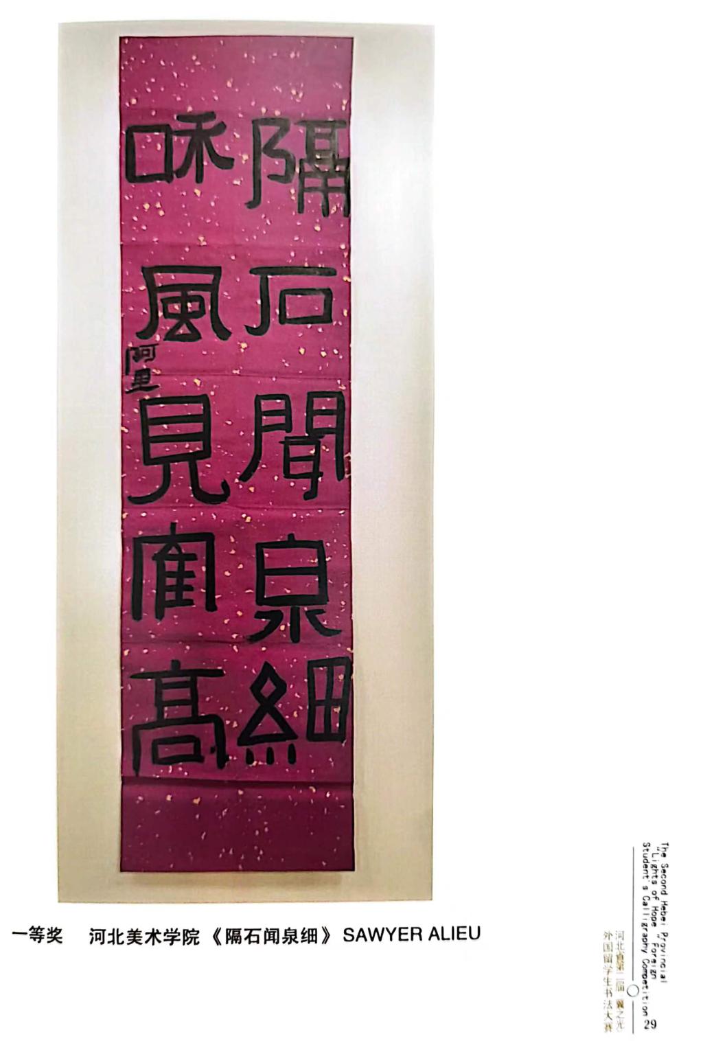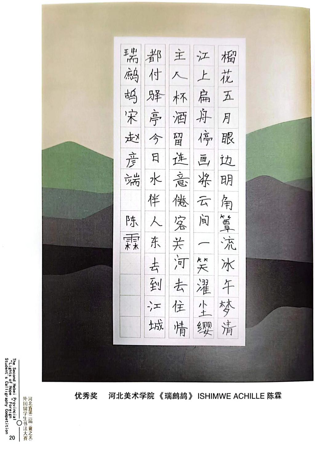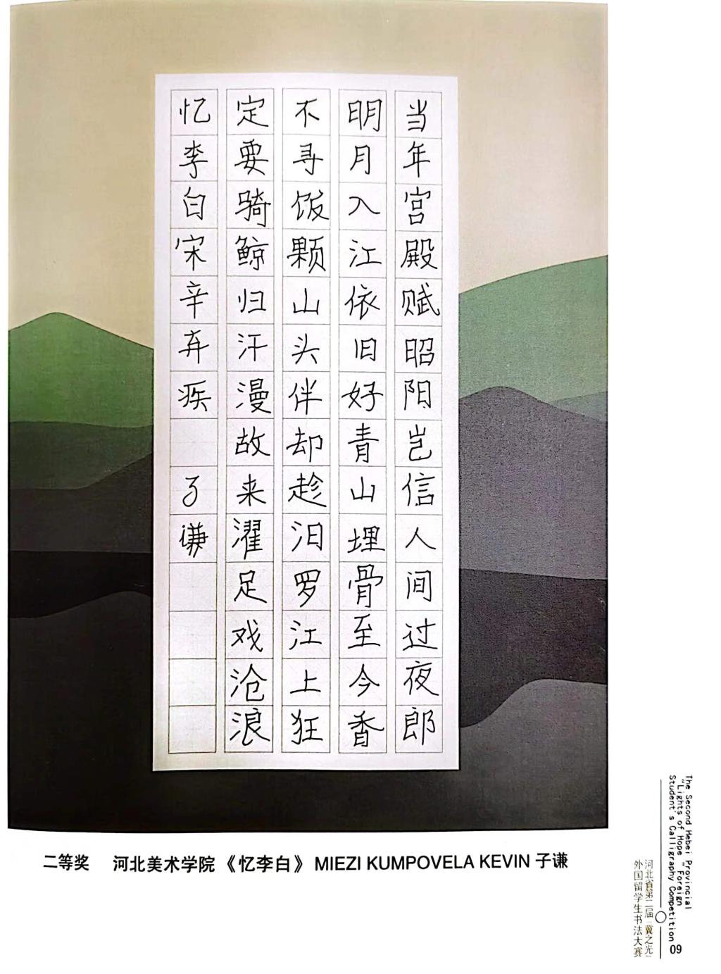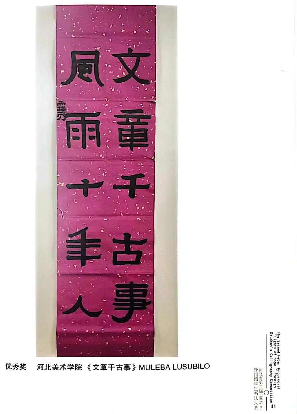 近日,由河北省教育厅主办,河北省教育宣传中心承办,河北经贸大学协办的河北省第二届“冀之光”外国留学生书法大赛获奖作品装订出版。beat365留学生分别获得一等奖1个,二等奖1个,三等奖2个,优秀奖4个。