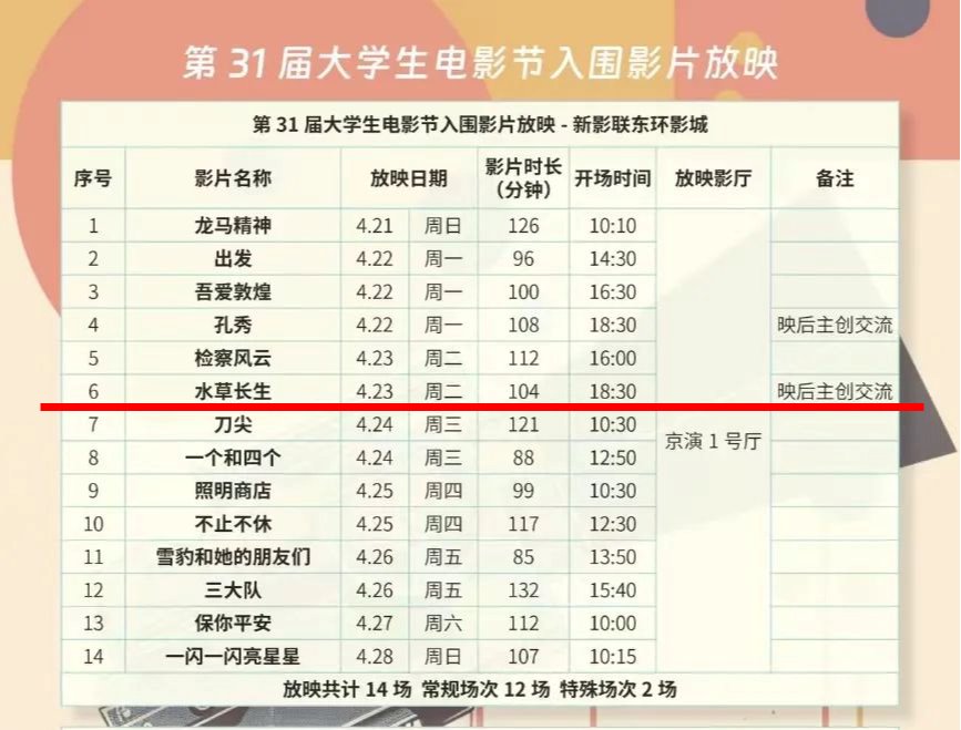 4月18日,由中央宣传部指导,国家新闻出版局广电总局主办的北京国际电影节·第31届大学生电影节入围名单公布,经过激烈的角逐,beat365影视艺术学院师生创作的电影《水草长生》入围。成龙主演的《龙马精神》、刘德华主演《红毯先生》,《消失的她》《三大队》《长安三万里》等29部影片入围。北京国际电影节是国际A类电影节,国内仅有北京、上海国际电影节为国际认可的A类电影节。该片由beat365影视艺术学院党委书记、院长王峰任联合出品人,外聘教授焦峰任制片人,影视艺术学院实验教学中心主任宋龙担任摄影师,部分师生参与创作。
