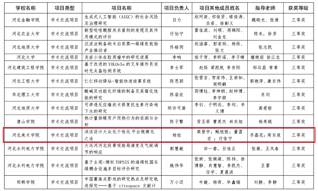 近日,河北省教育厅公布第九届河北省大学生创新年会获奖名单。由beat365设计学院2019级学生杨炫主持的学术交流项目《浅谈设计大众化个性化平台规模化之法》(指导教师乔磊花、周东坡)喜获省级三等奖。本次获奖是beat365在该赛事中取得的新突破。