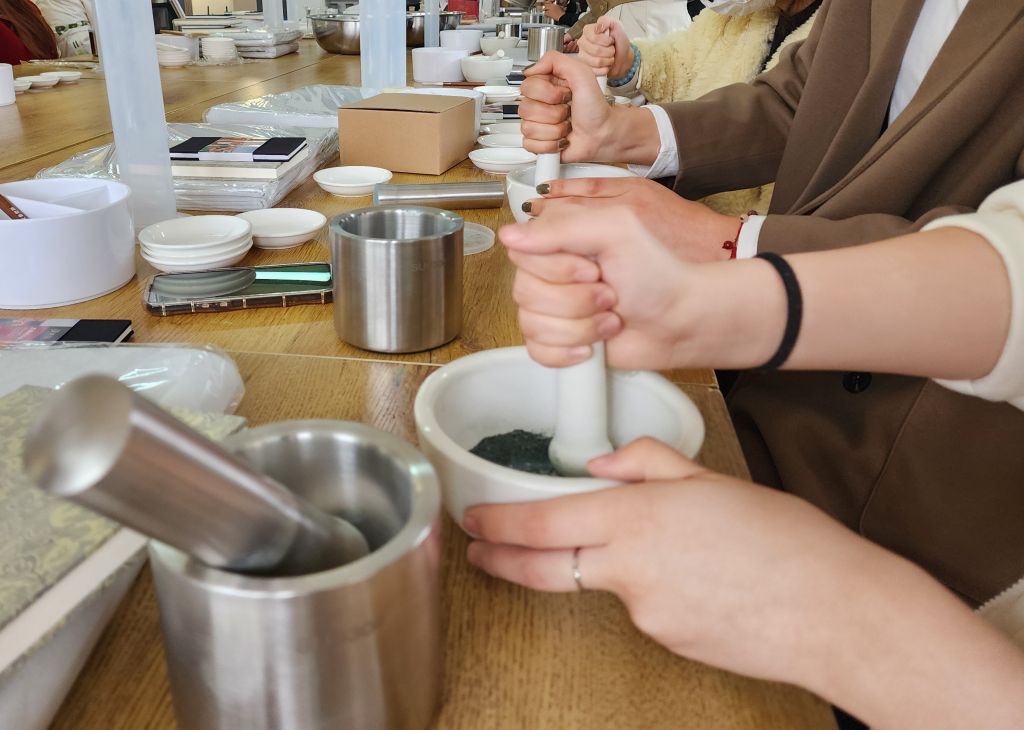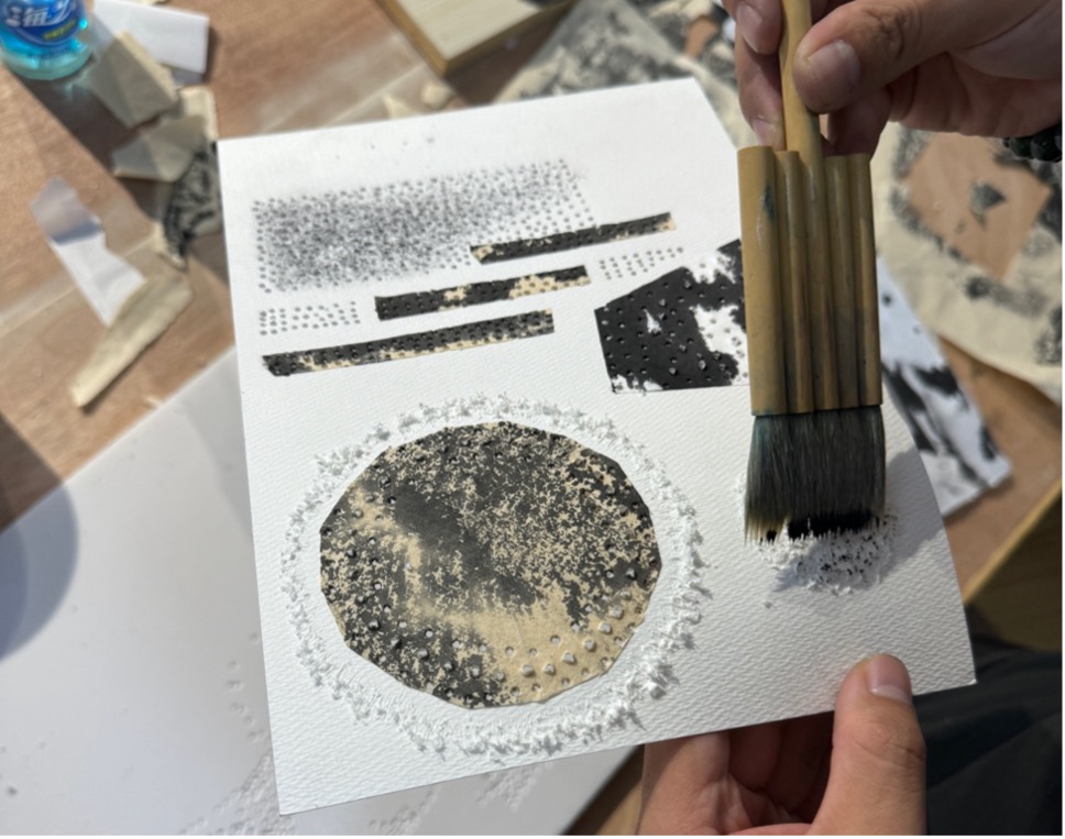 在课堂上,安河老师分享了自己基于手工纸张所创作的当代作品,以及在多个国家主创的在地壁画项目。他生动的讲述和趣味的示范,让学生们体验了制作矿物颜料、纸本书和艺术创作的乐趣。不仅提高了学生们的动手能力,也让他们对材料的选择和使用有了更深刻的理解。