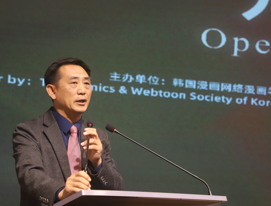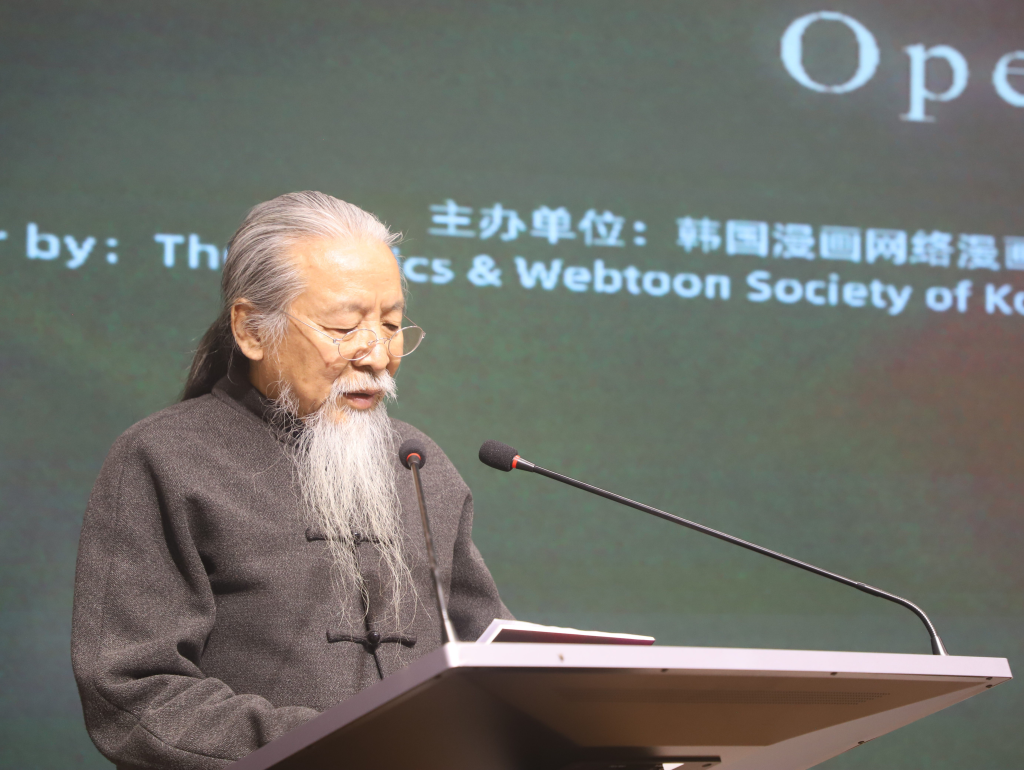 开幕式现场气氛热烈,北京印刷学院新媒体学院副院长严晨、河北省漫画家协会漫画艺委会副主任高世迎、东亚艺术学会会长权锡焕、木浦大学教授白钟声、鲁迅美术学院传媒动画学院原院长王亦飞、东莞城市学院创意设计学院乡村振兴学院院长郭冶等特邀嘉宾纷上台致辞,表达了对国际交流展览圆满开幕的热烈祝贺,并表示本次国际交流展览不仅是漫画艺术的精彩展示,更是艺术家们文化对话和思想交流的重要平台。