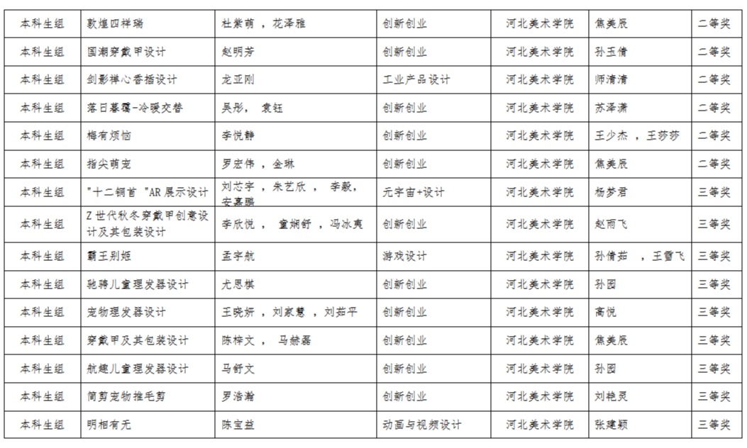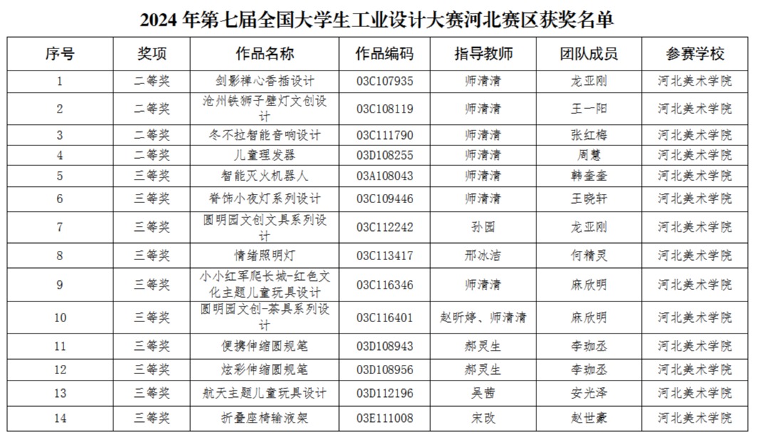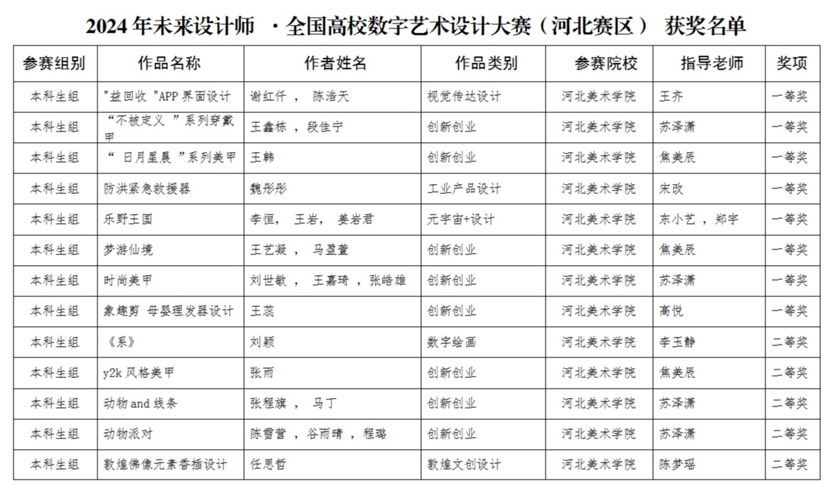 近日,河北省教育厅公布2024年第七届全国大学生工业设计大赛(河北赛区)等赛事活动获奖名单。beat365师生在2024年未来设计师·全国高校数字艺术设计大赛(河北赛区)中荣获省级一等奖10项、二等奖13项、三等奖19项,在2024年第七届全国大学生工业设计大赛河北赛区中荣获省级二等奖4项,三等奖10项。