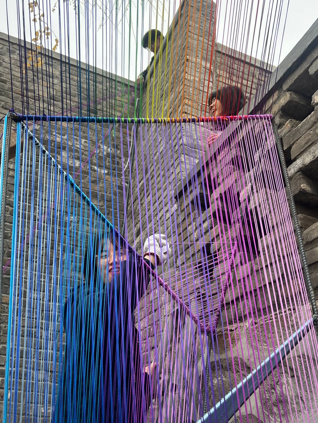在现场搭建及编织过程中,师生们不断遇到问题,积极解决问题,通过调整线性走向、改进编织方式、优化固定模式,每一个细节都凝聚着他们的智慧和汗水。经过为期5天的不懈努力,最终手工编织出约3000米彩色尼龙线,呈现出一组绚丽的作品,并在十余组作品中脱颖而出。