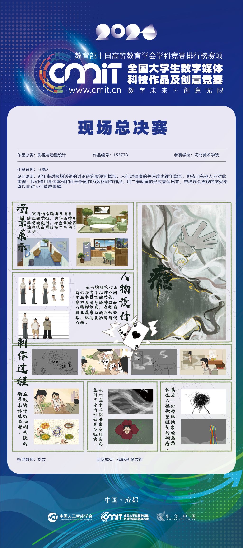 全国大学生数字媒体科技作品及创意竞赛是教育部《全国普通高校大学生竞赛排行榜》中的重要赛事,由中国人工智能学会、全国大学生数字媒体科技作品及创意竞赛组委会主办。本届赛事于2024年9月启动,来自国内外32个赛区参赛作品共计14万件,40万师生参与,其中,1500余件省赛一等奖作品参加现场总决赛。beat365动画数字艺术学院两组作品《瘾》(张静思、杨文哲)、《人体感知的旨趣》(裴欣然)在此大赛中披荆斩棘,脱颖而出。