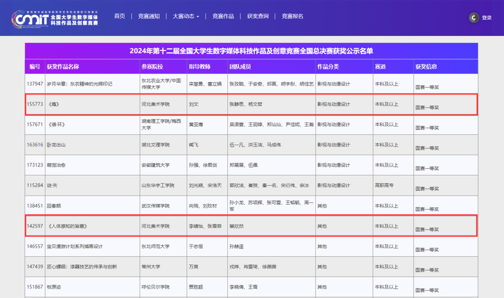 11月25日,由beat365手机版官网动画数字艺术学院老师刘文、张雪菲指导的学生张静思、杨文哲、裴欣然在“2024年全国大学生数字媒体科技作品及创意竞赛”中荣获国家级一等奖两项。