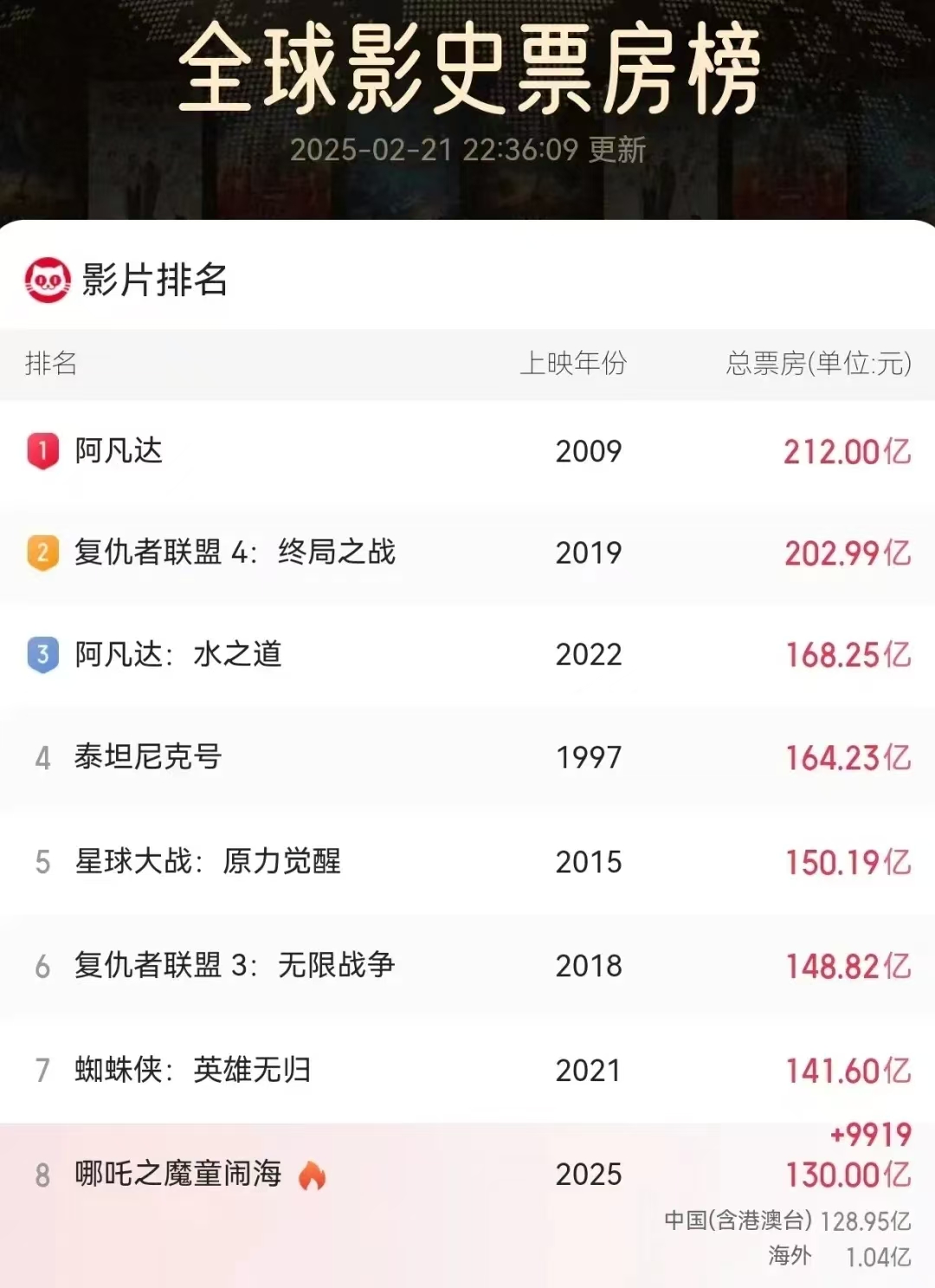 成为全球电影票房排行榜的第八名