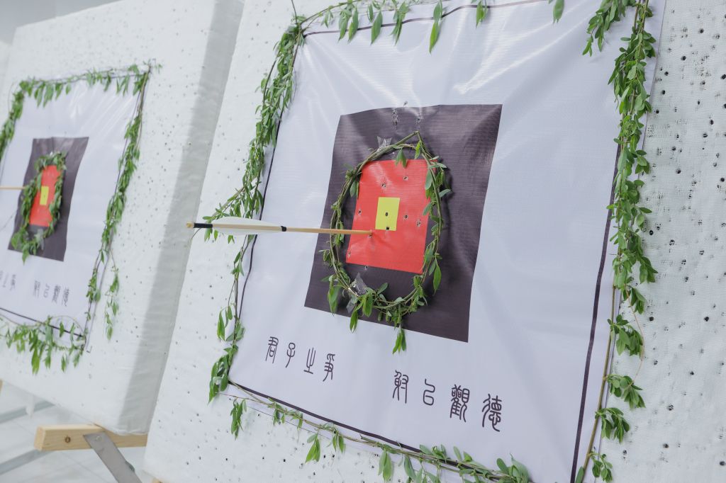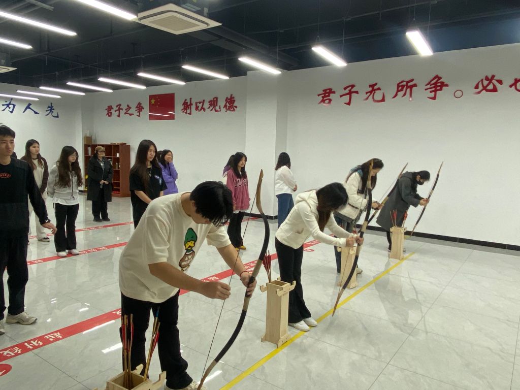 活动中,学生们学习“拇指勾弦、食指压箭”的传统握弓手法,通过持弓礼仪体会“身正、心静、箭直”的射礼精神。礼射环节成为全场焦点,学生身着素色汉服,手持无镞竹弓,依次向自制的柳枝箭靶行“三射礼”:一射驱邪秽,二射祈丰年,三射敬先贤。鼓手以节奏分明的击鼓声为仪式伴奏,箭鸣与鼓点交织,重现了古代射礼的庄重与诗意。