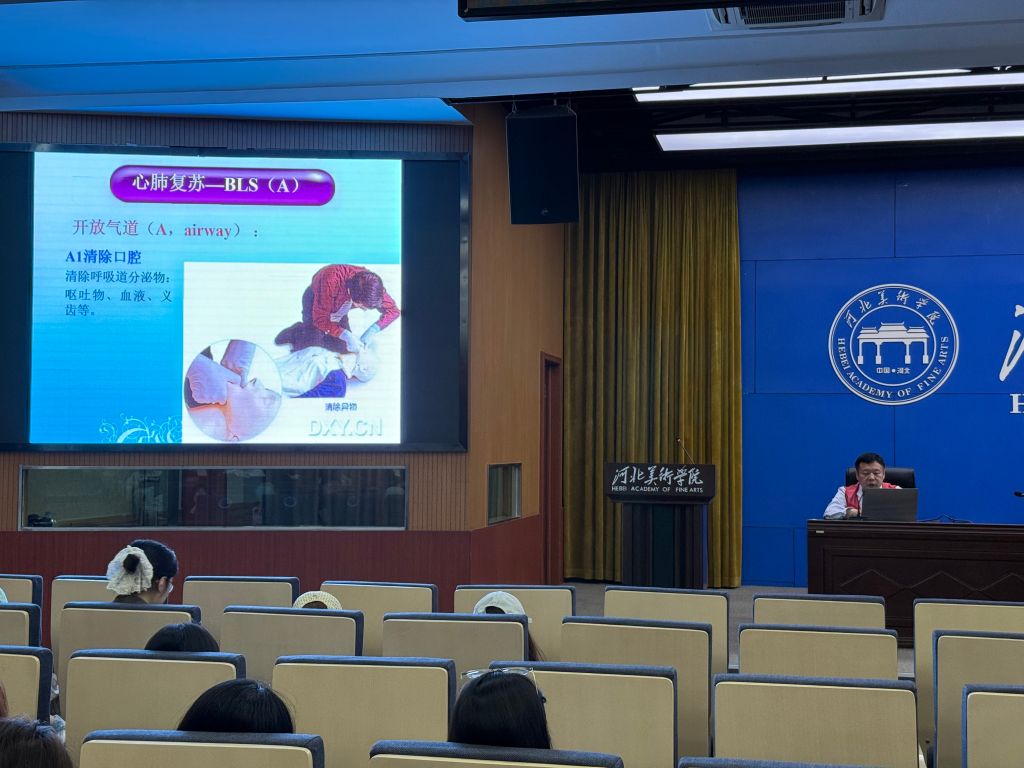 新乐市中心医院吕永刚主任详细讲解了基本疾病预防知识和应急救护理念,并且用通俗易懂的语言、生动具体的案例讲解了救护概论、心肺复苏、AED使用、气道异物梗阻急救、创伤救护等五大核心内容。他强调,健康是人生的基石,大学生不仅要学习知识,更要学会如何科学地管理自己的健康。