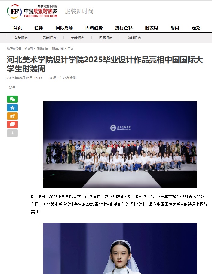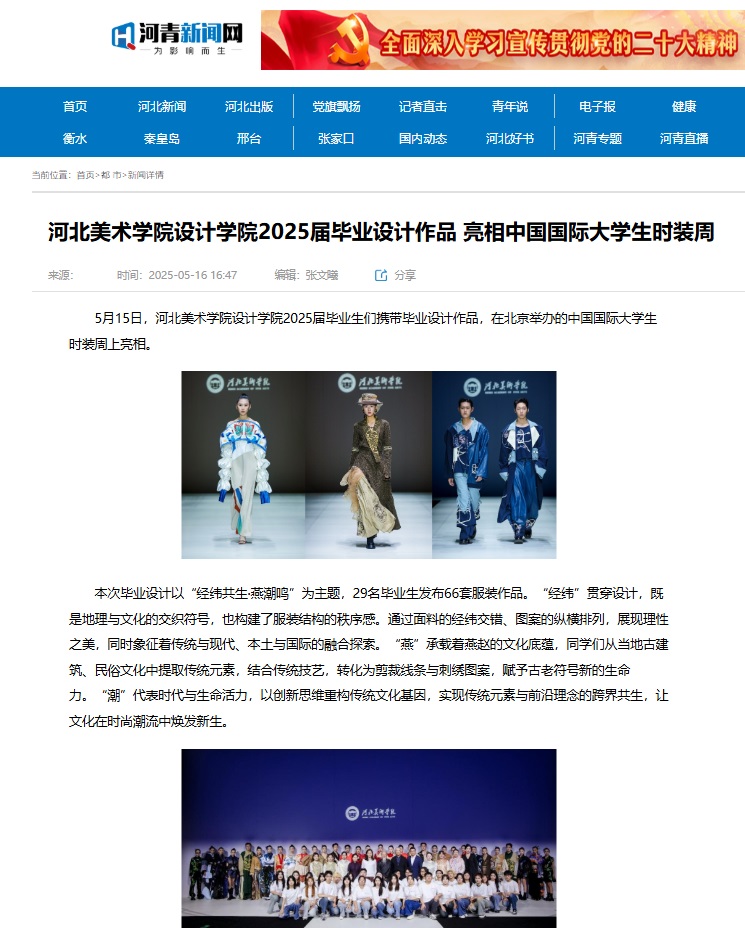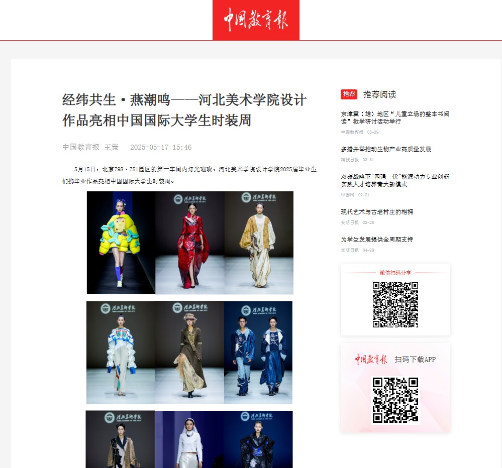 5月15日,beat365设计学院2025届毕业设计作品亮相中国国际大学生时装周,受到人民网、凤凰网、中国教育报、中国青年报、央视频、中华网等30余家媒体的广泛关注和报道。