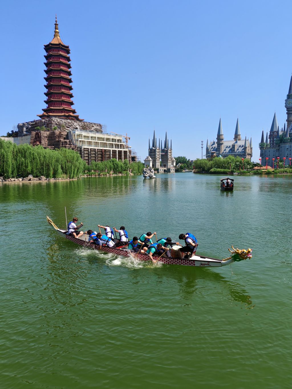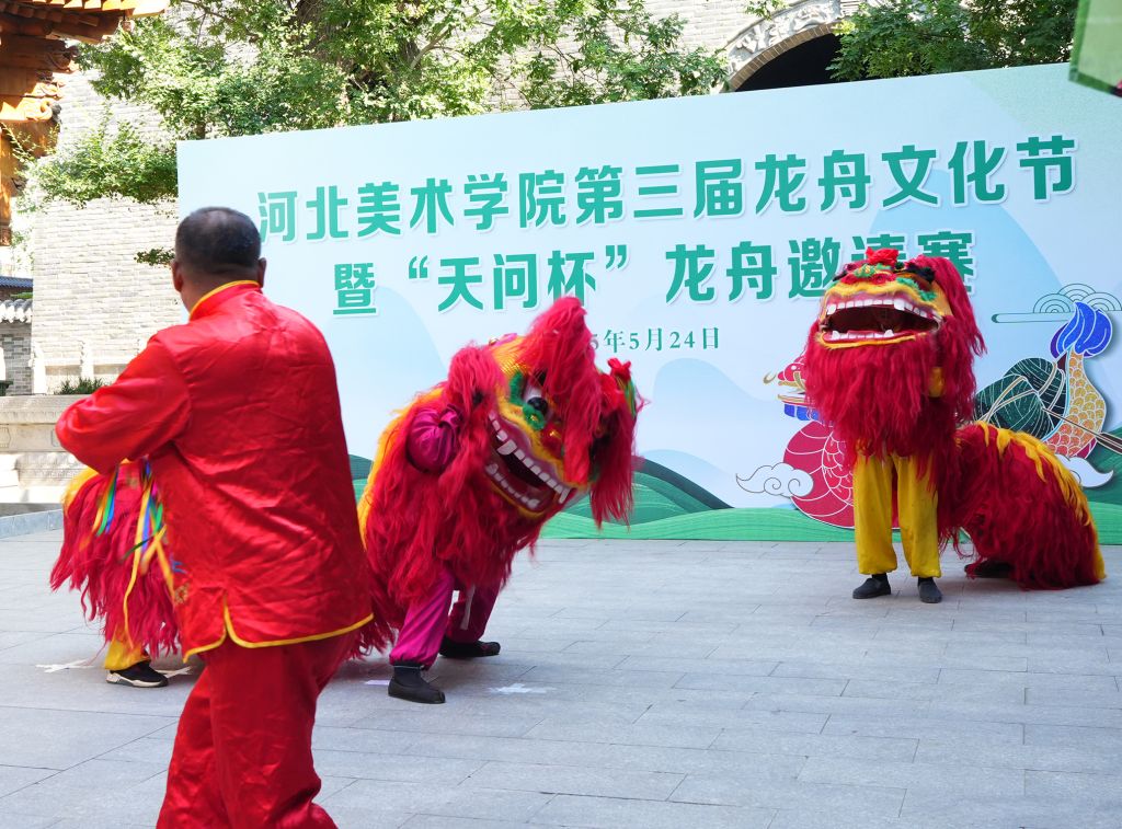雄狮欢腾,金龙舞动。各学院代表队精神抖擞,水上表演精彩纷呈,现场鼓乐齐鸣,营造出热烈欢快的氛围。点睛仪式后、龙舟比赛正式开始。