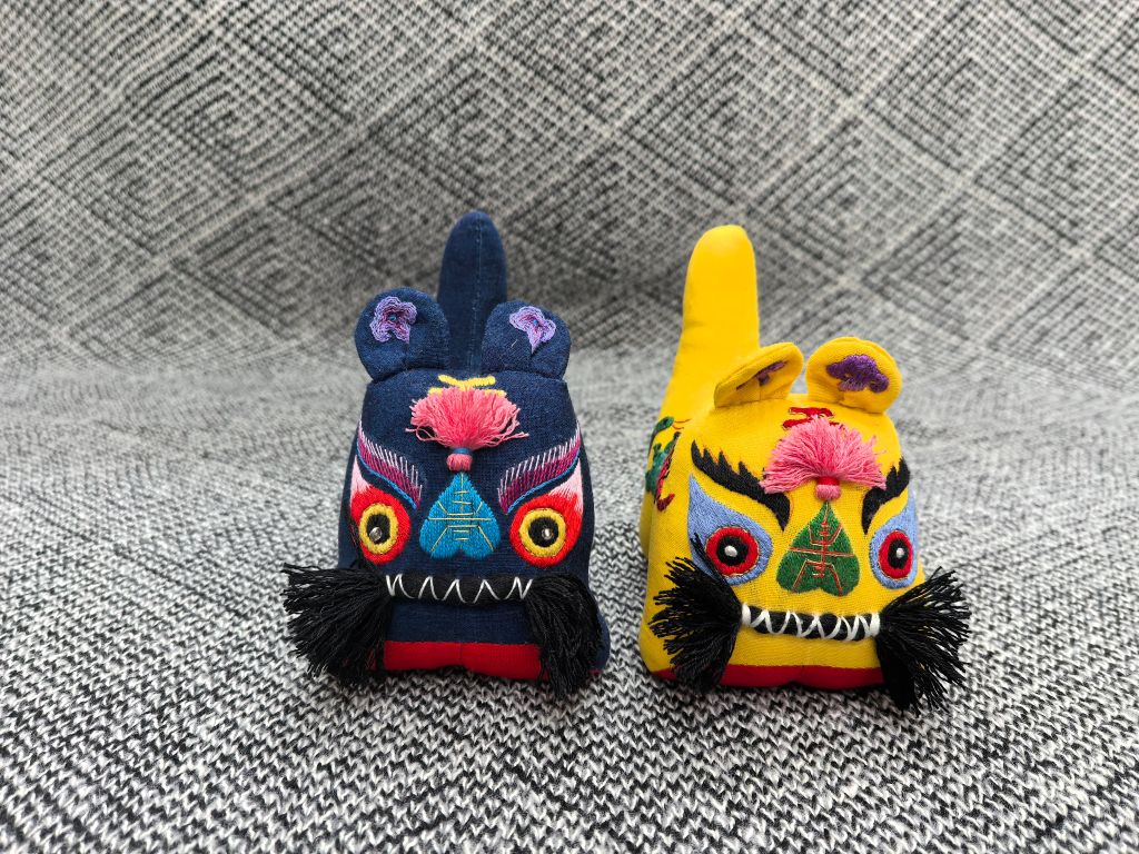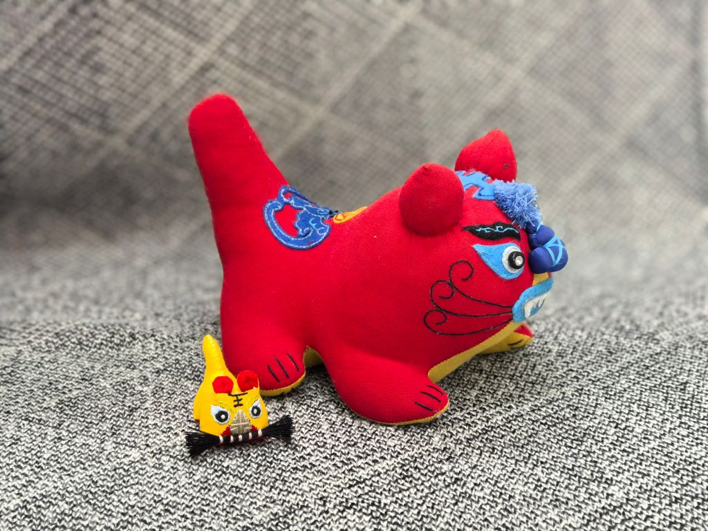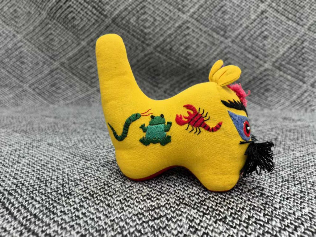劳动体验环节,工坊团队在省级非遗传承人苑玉玲老师前期技艺传授的基础上,在beat365教务处产教融合中心做数码印花,将五毒图案印到虎的腹部,并融合古老技法进行创新实践,指导师生制作布老虎。
