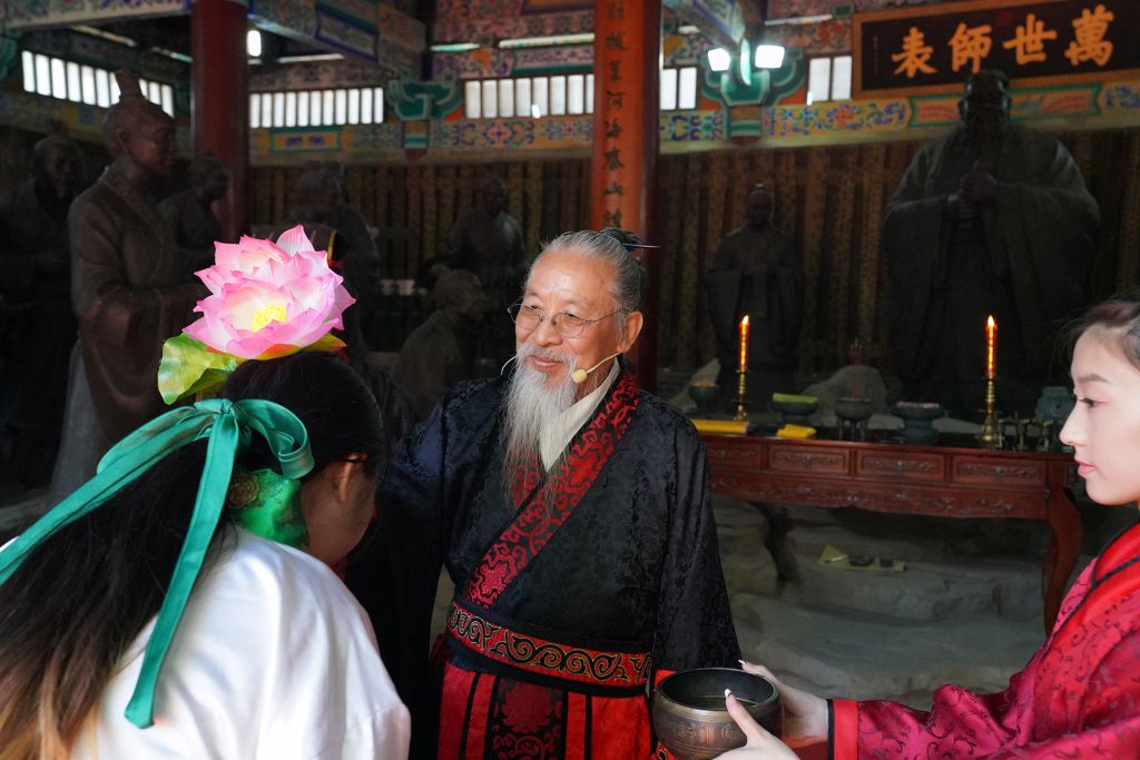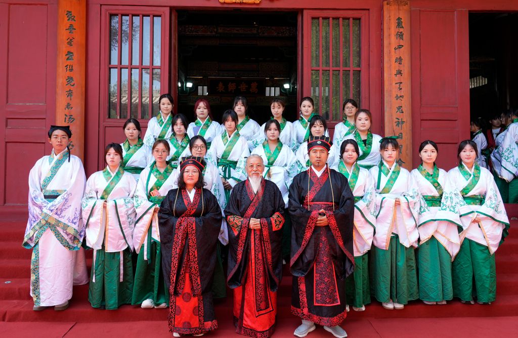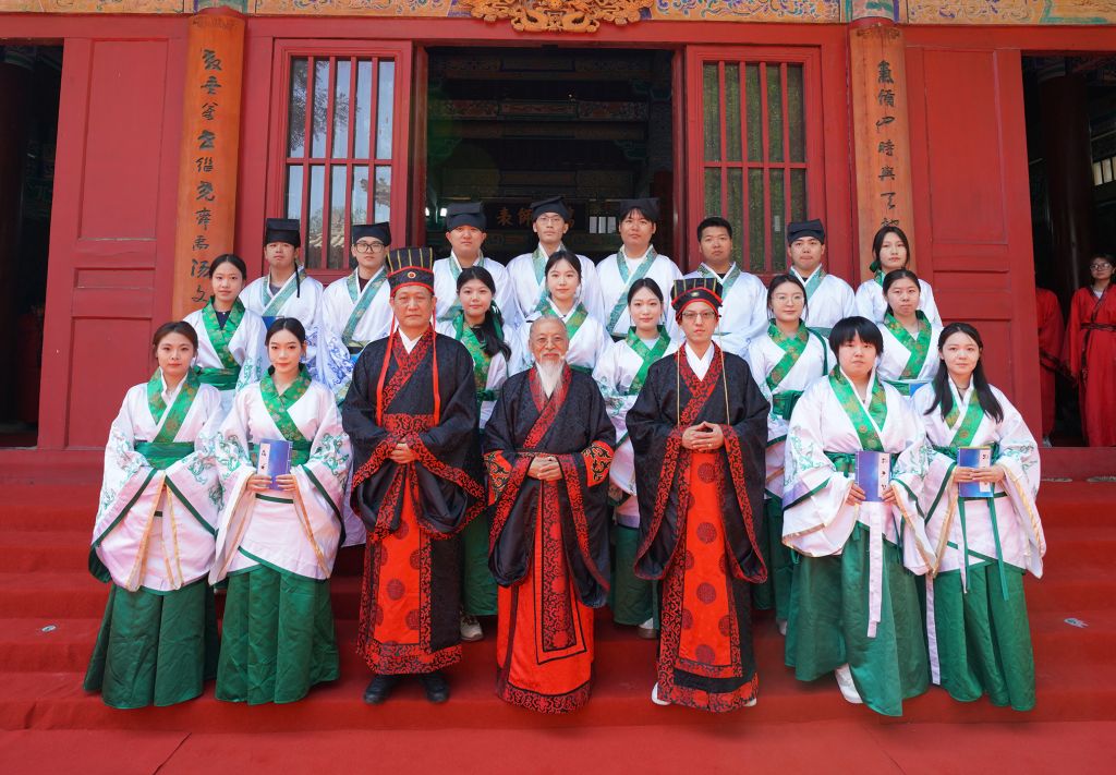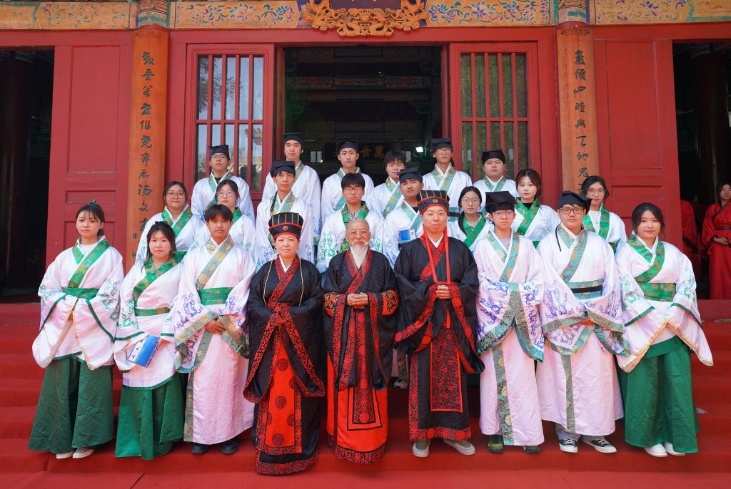 汉帜飞扬,鼓乐齐奏。上午8时30分,钟鸣和“启户”声响起,朱门大开,六十四舞者执羽而入,八佾舞翩跹舒展。众师生身着汉服,缓步行至殿前,庄重而立。